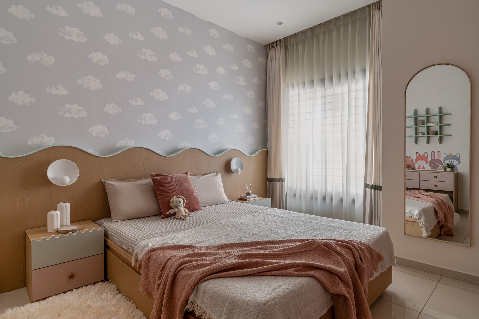 Beyond the communal zones, the apartment unfolds into three distinct yet interconnected rooms. The home office adopts a measured material palette of oak finished laminates and matte black hardware, balancing warmth with focus. Metallic cork wallpaper introduces a gentle textural surprise, preventing the workspace from feeling overly austere. The daughter’s bedroom, by contrast, embraces a more playful expression of the home’s curved language. A wave patterned headboard, blush and sage accents, circular bedside lights, and cloud themed wallpaper shape a space that feels imaginative yet timeless, designed to evolve rather than expire.