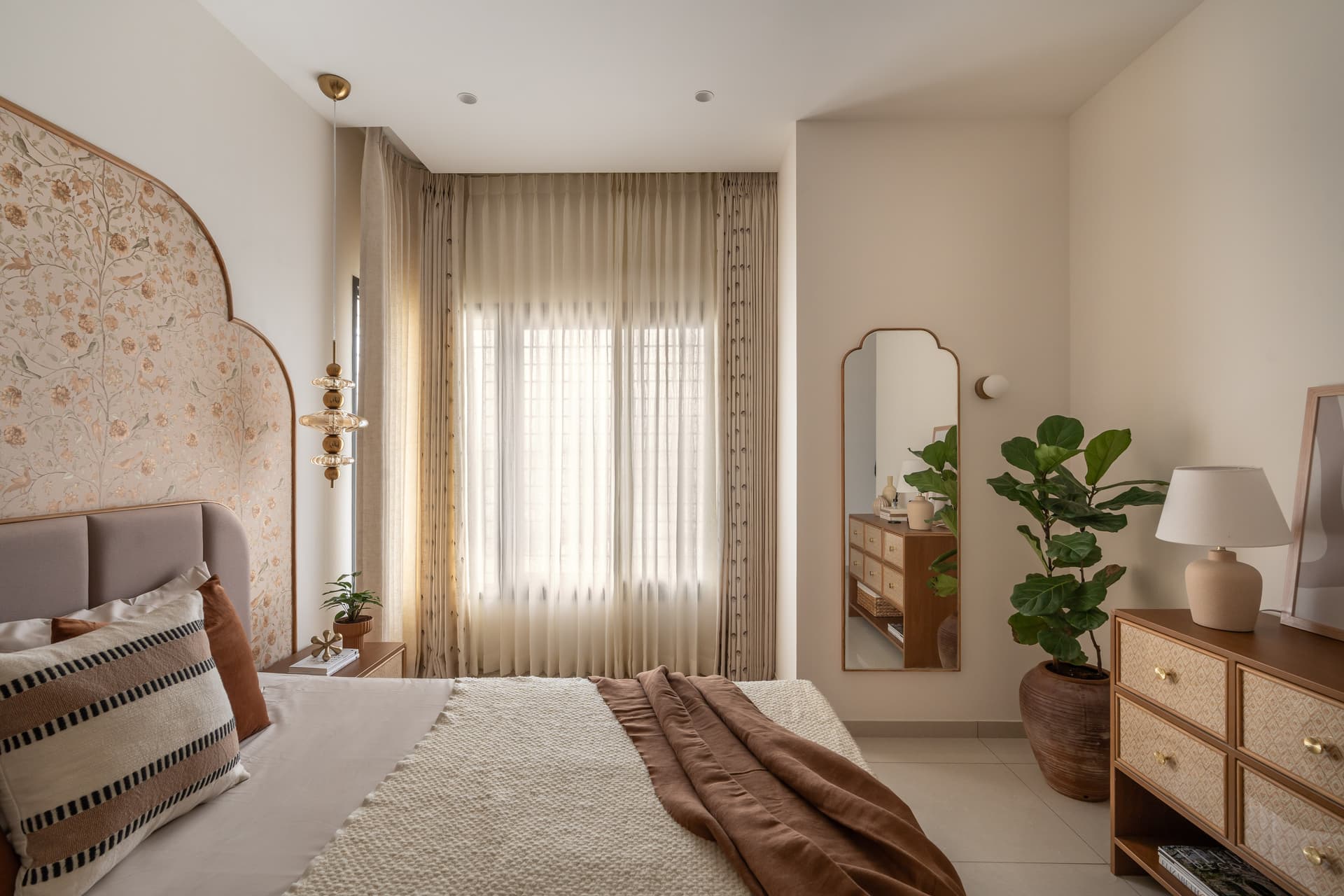 The master bedroom articulates the apartment’s most layered material story. Semi curved teak beading frames floral wallpaper in muted tones, establishing depth through texture rather than colour. Natural fibre wrapped drawers, brass accents, amber glass lighting, and ivory PU wardrobes compose a palette that feels tactile and enduring. Curves reappear not as repetition but as rhythm, reinforcing the apartment’s quiet coherence.