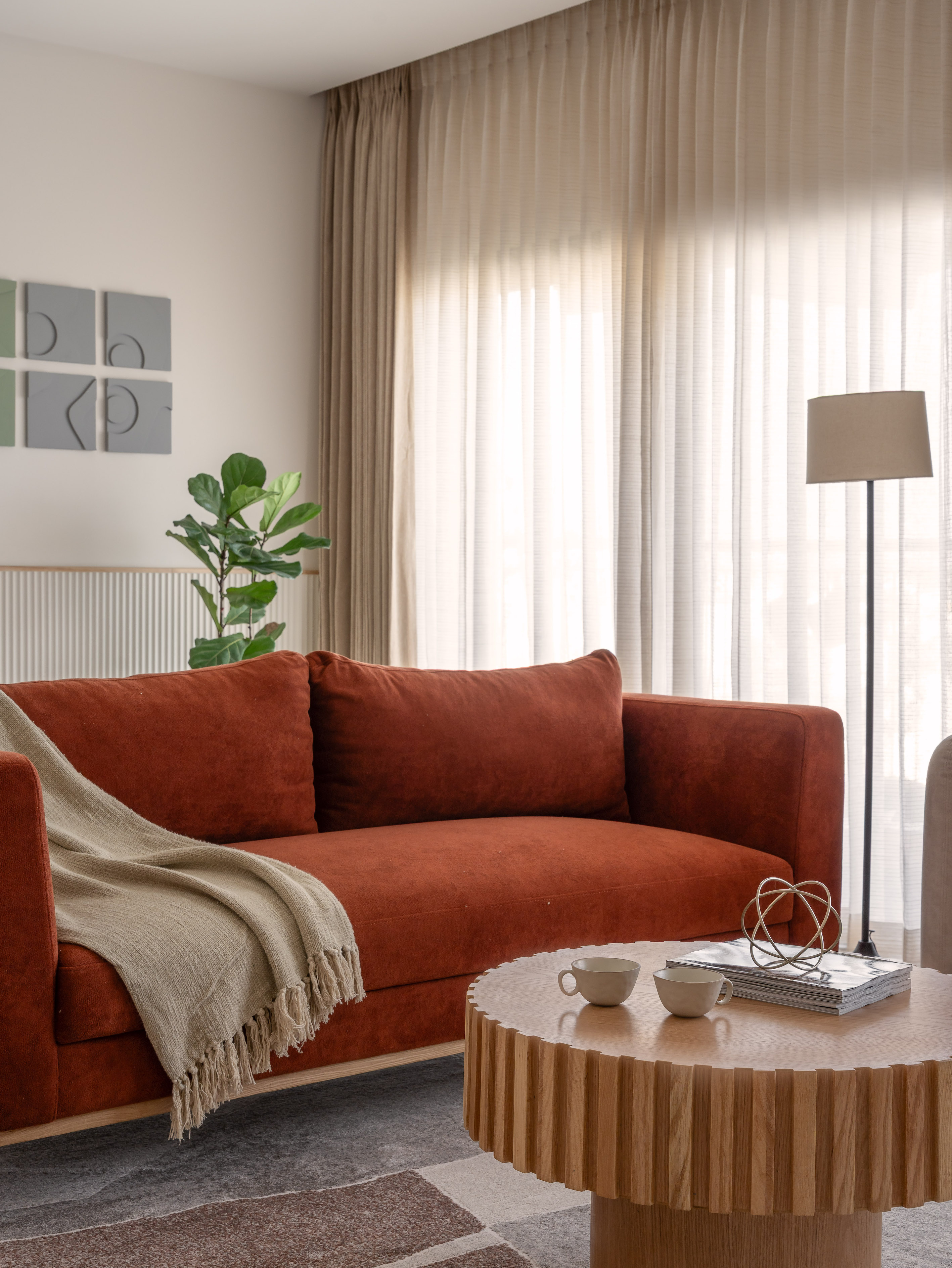In the living area, the composition balances visual order with lived in ease. A vertically grooved MDF TV wall in matte cream conceals functional clutter, preserving a seamless aesthetic. Floating oak laminate drawers reinforce the room’s lightness, while a matte black MS display unit introduces measured contrast. The seating arrangement anchors the space both visually and emotionally, a rust orange sofa lending depth and character, paired with an ivory chaise whose curved silhouette echoes the foyer’s softness. At the centre, a fluted coffee table extends this language, its rounded edges and vertical ridges transforming utility into sculpture.