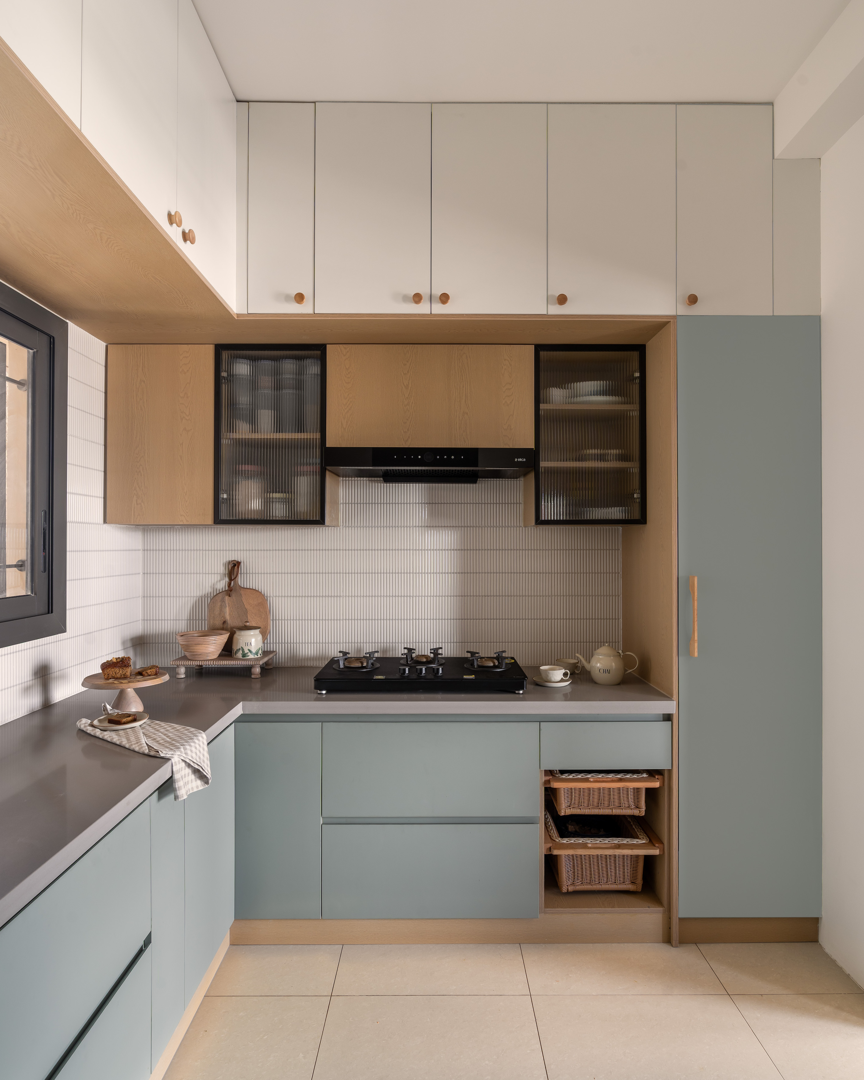 The kitchen, visible through an open transition, shifts the material narrative while preserving continuity. Designed around the homeowner’s precise functional needs, the space centres on muted base cabinetry whose understated tone establishes visual calm. A dove grey quartz countertop introduces durability and refinement, while white kitkat patterned tiles lend rhythmic texture. The restraint of the palette ensures longevity, resisting the fatigue of overt trend driven colour.