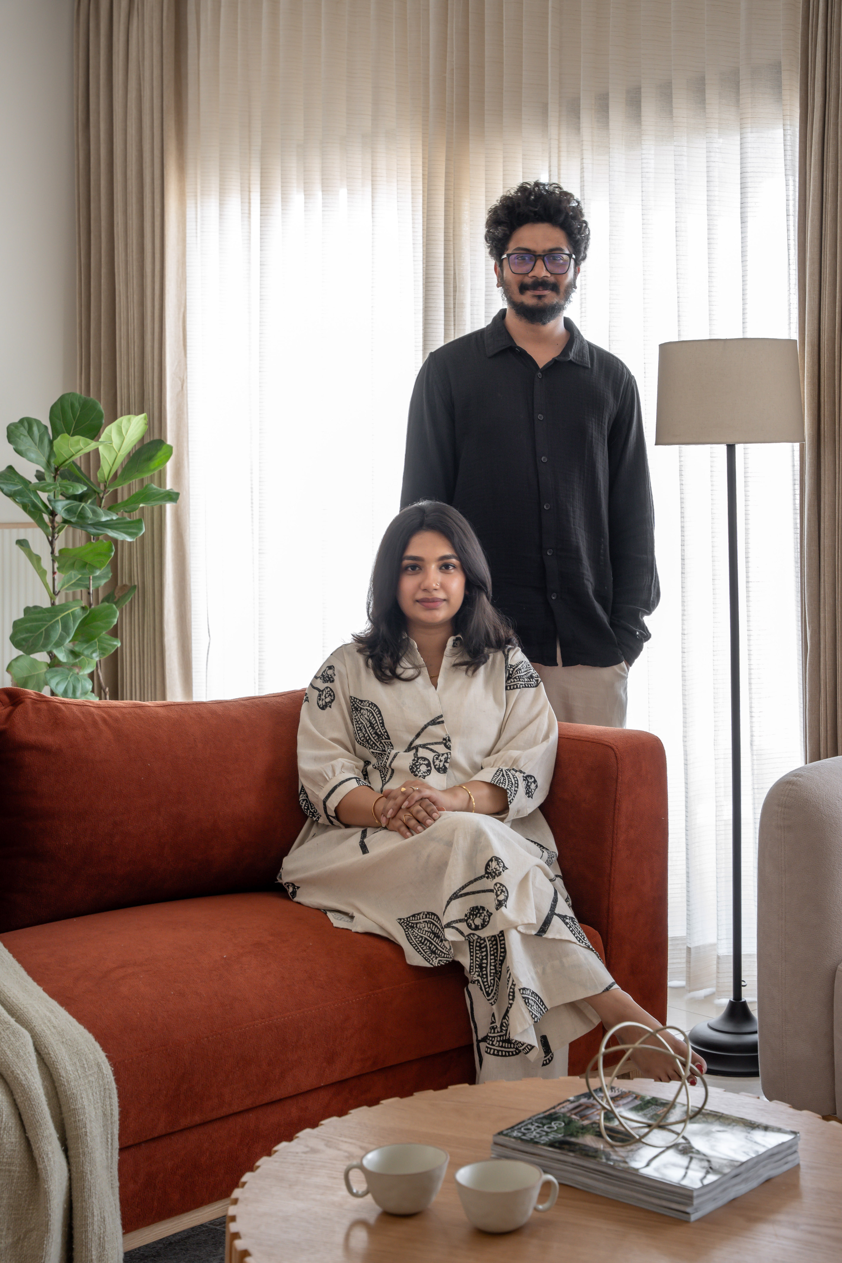 Natural light plays an equally formative role. Floor to ceiling windows dissolve boundaries between inside and outside, with sheer linen textured curtains diffusing Bangalore’s changing daylight into a softer glow. Biscuit toned drapes elongate the volume, while a muted carpet grounds the ensemble. The result is a living space that feels composed yet adaptive, structured enough for visual coherence, relaxed enough for everyday life.