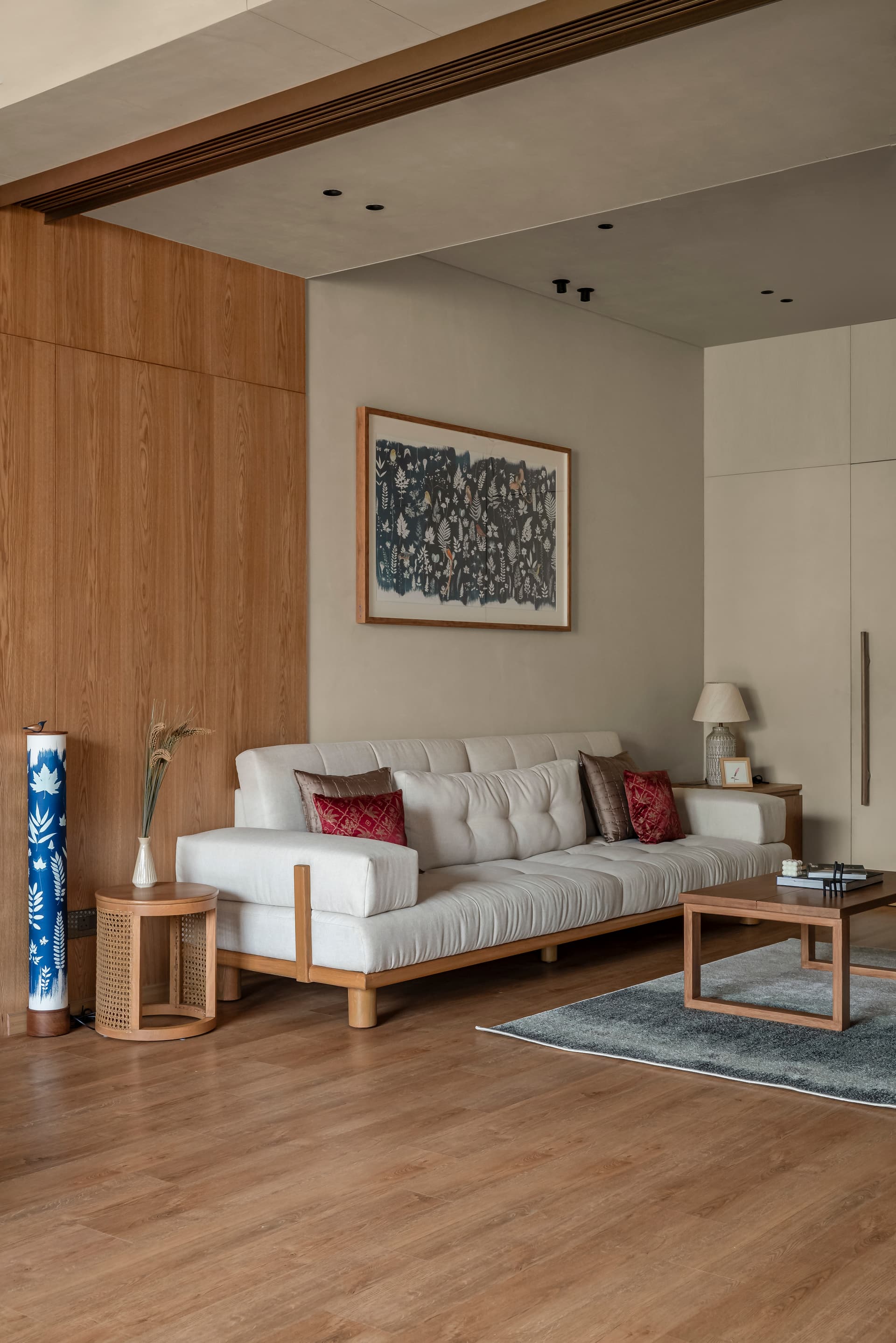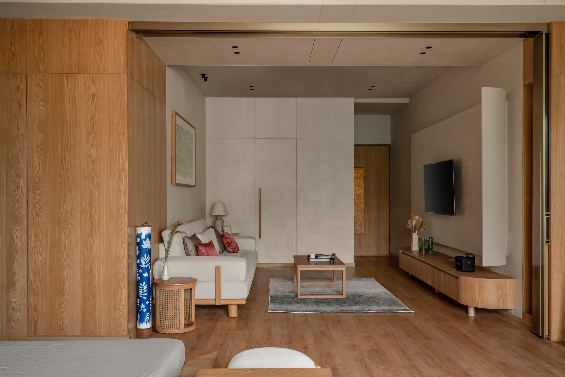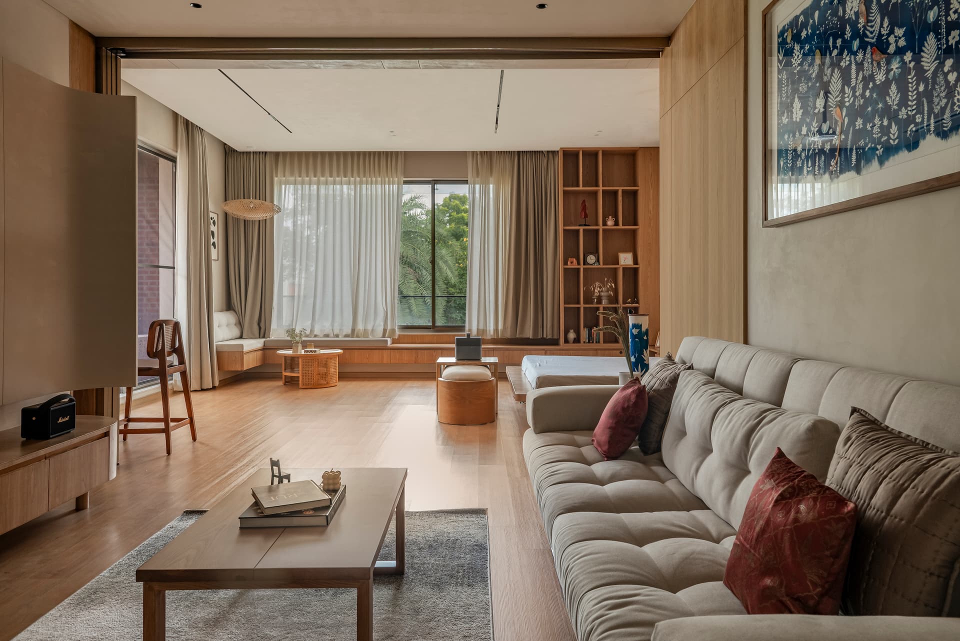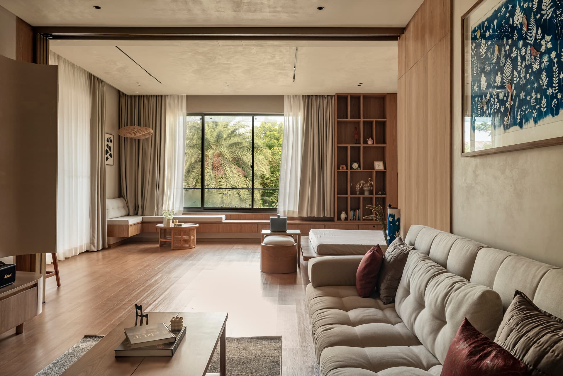 The design brief called for a premium bedroom extension that would remain deeply connected to the outdoors. Orientation became the guiding force, with the east-facing terrace and south-facing bedroom wall shaping the spatial strategy. Large openings, cross-ventilation, and filtered daylight allow the interiors to breathe, creating a constant dialogue between inside and out. Rooted in Japandi aesthetics, the material palette is intentionally restrained—lime-wash plaster, warm wood, natural veneers, and SPC flooring come together to create a soft, tactile environment. Sheer curtains diffuse daylight across the rooms, while rounded bespoke furniture, built-in window seating, and subtly toned fabrics maintain visual lightness. Indigo cyanotype-inspired artwork punctuates the neutral canvas, adding depth without disrupting the overall calm.