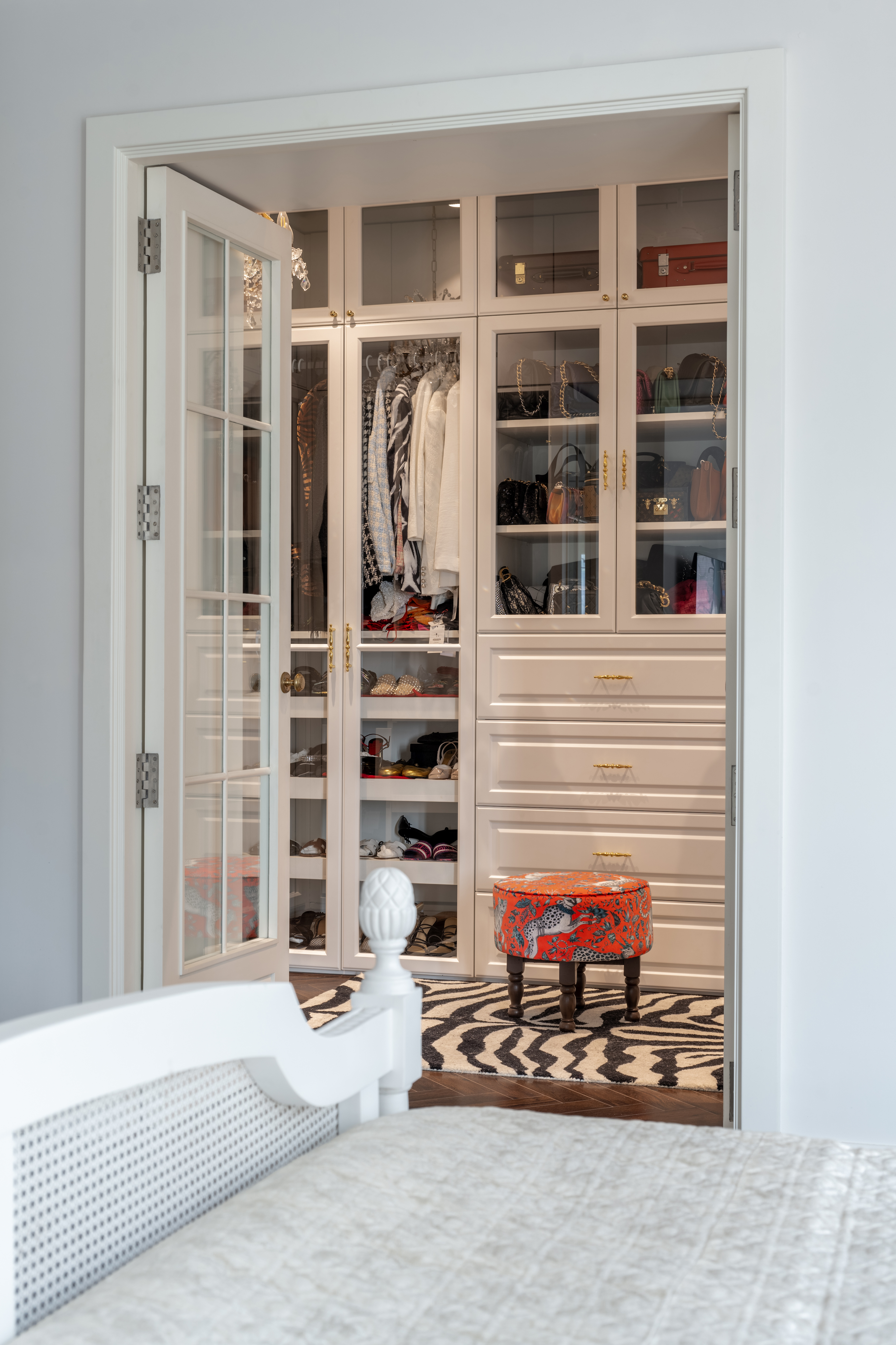 A standout feature is the walk-in wardrobe, nearly room-sized, clad entirely in white with a mix of glass-front shutters, panelled doors, and open shelving. An ornate sit-down dresser completes the boutique-inspired experience. The ensuite bathroom echoes the home’s signature palette, combining marble and tiles with a walnut-finished vanity, oversized washbasin, and a chandelier that adds a subtle, ambient glow—transforming the space into a luxurious, spa-like haven.