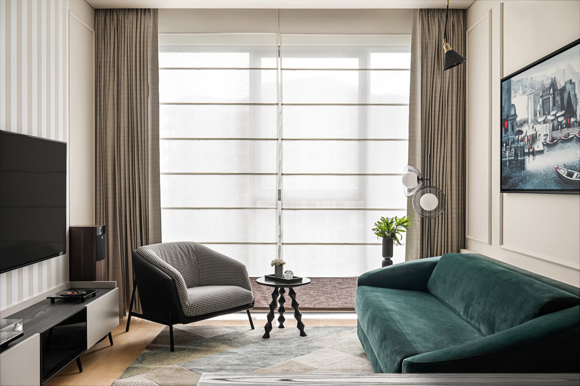 More than just a workspace, Ananta’s home office is designed as a sanctuary of thought and creativity. A full-length oakwood bookshelf anchors one side, imparting warmth and gravitas, while the opposing wall, clad in classic wainscoting, exudes understated grandeur. A black-stained wood desk, paired with a Herman Miller chair, forms the functional core, ensuring both comfort and productivity. Yet, the space transcends its utilitarian purpose. An emerald green sofa bed, positioned adjacent to a streamlined media unit, transforms the room into an intimate retreat. Above, a captivating painting of Varanasi by a local artist imbues the space with cultural authenticity, grounding the room in its Indian context.