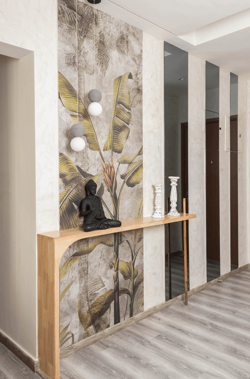 As soon as you step into the foyer, you’re greeted by a stunning design feature that immediately draws the eye. Three strips of mirrors, artfully arranged along the wall, create the illusion of a larger and more expansive space in what might otherwise be a narrow and cramped passageway. Moving further into the foyer, the design story continues to unfold with a tropical wallpaper that infuses the space with a sense of drama and energy. A light, wooden console table and a pair of hanging pendant lights provide a stylish and functional touch, while the wallpaper is artfully mimicked on the diagonally opposite wall, creating a sense of continuity and flow throughout the space. Altogether, this foyer is a testament to the power of well-executed design, with each element coming together seamlessly to create a cohesive and visually striking space.
