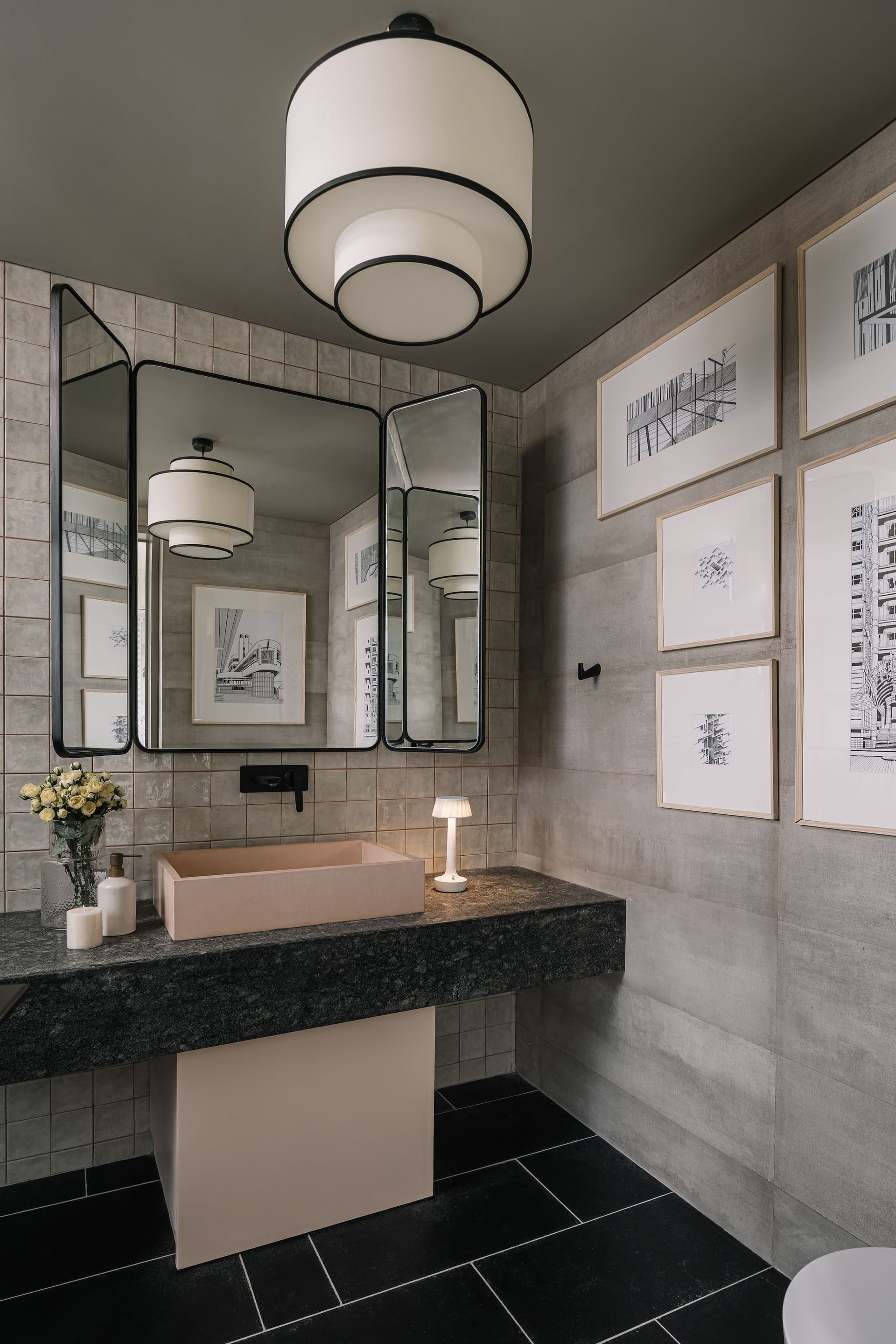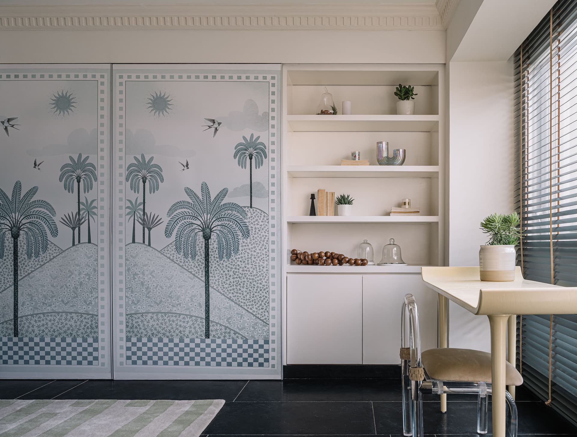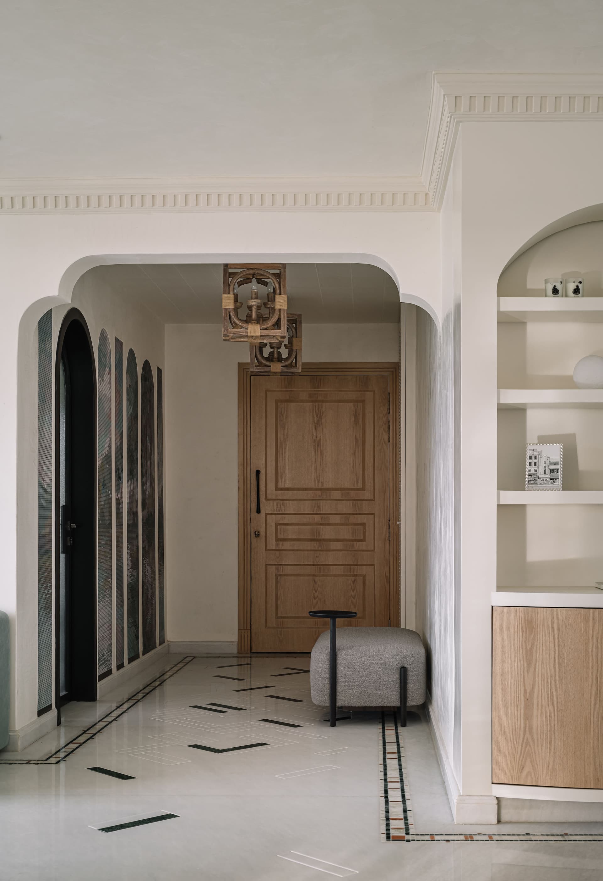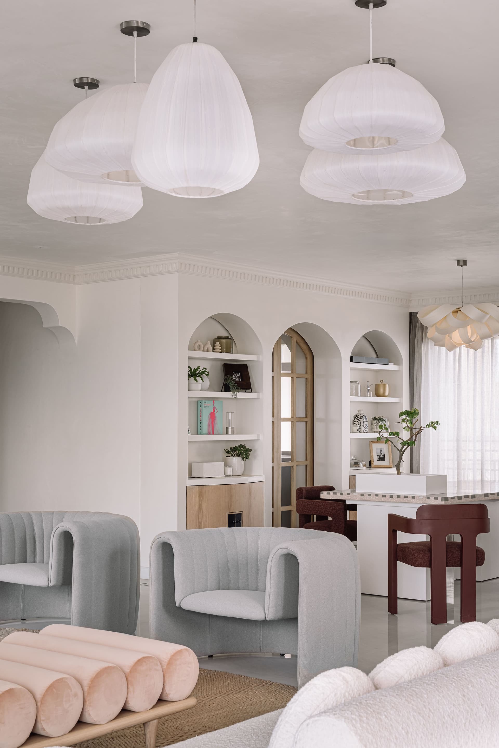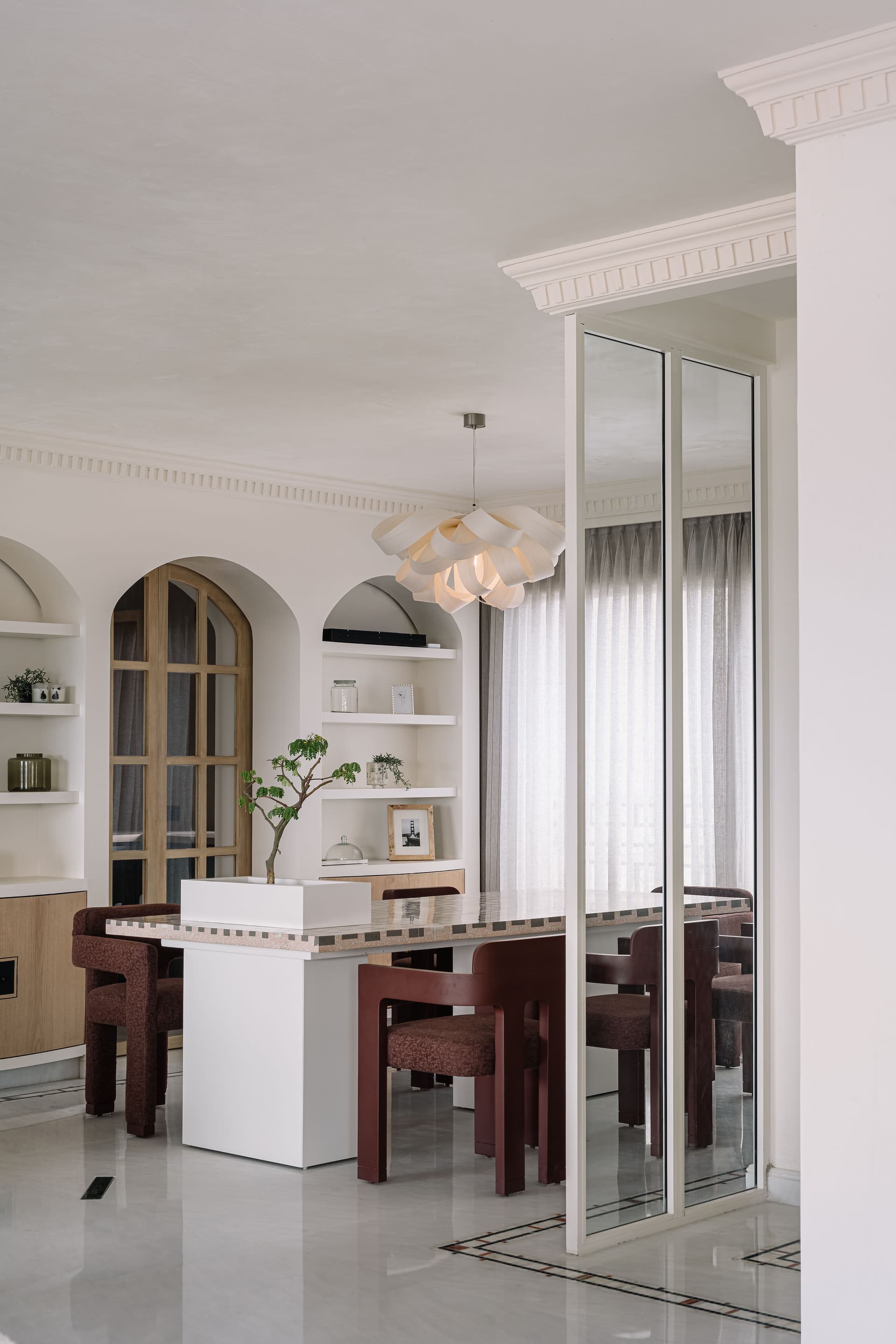 At the heart of the penthouse, the dining area unifies the layout, fostering moments of gathering and celebration. A custom terrazzo-in-situ dining table by Rawsteen, with its organically shaped multitone surface, echoes the home’s fluid design philosophy. Above, an LZF pendant light, inspired by unfurling ferns, reinforces the nature-infused narrative. A series of arches house curated objets d’art while discreetly concealing storage, with one archway leading into a dusty teal modular kitchen—both stylish and functional.