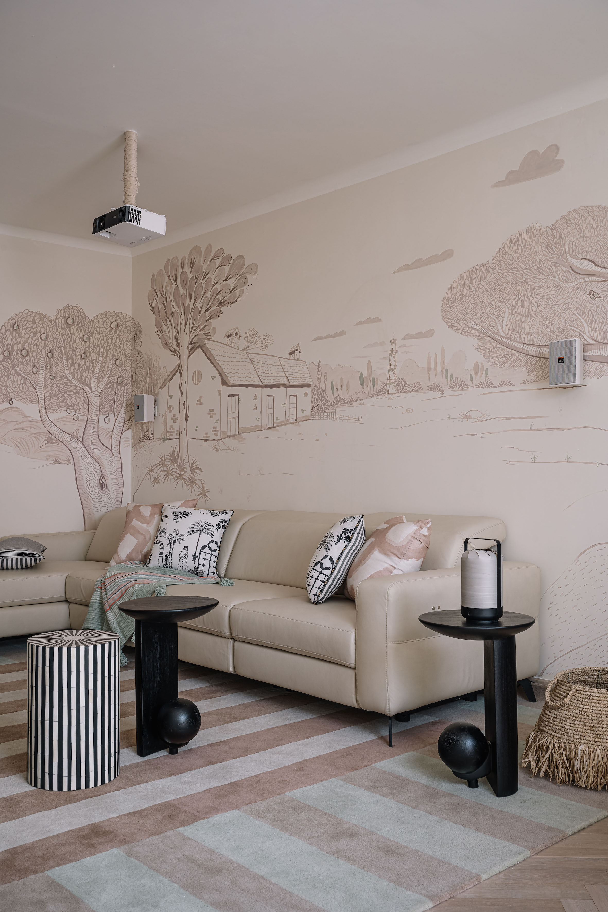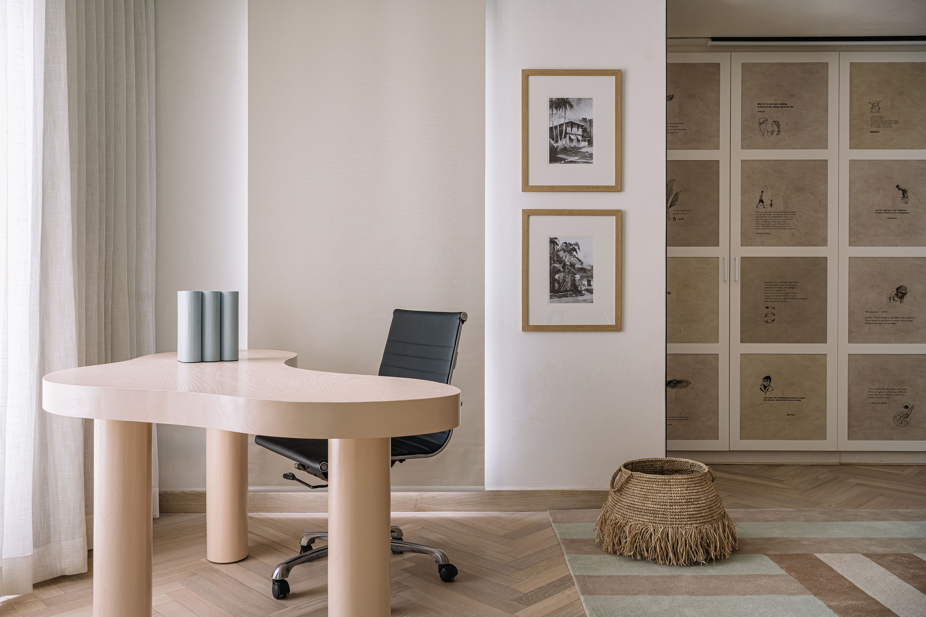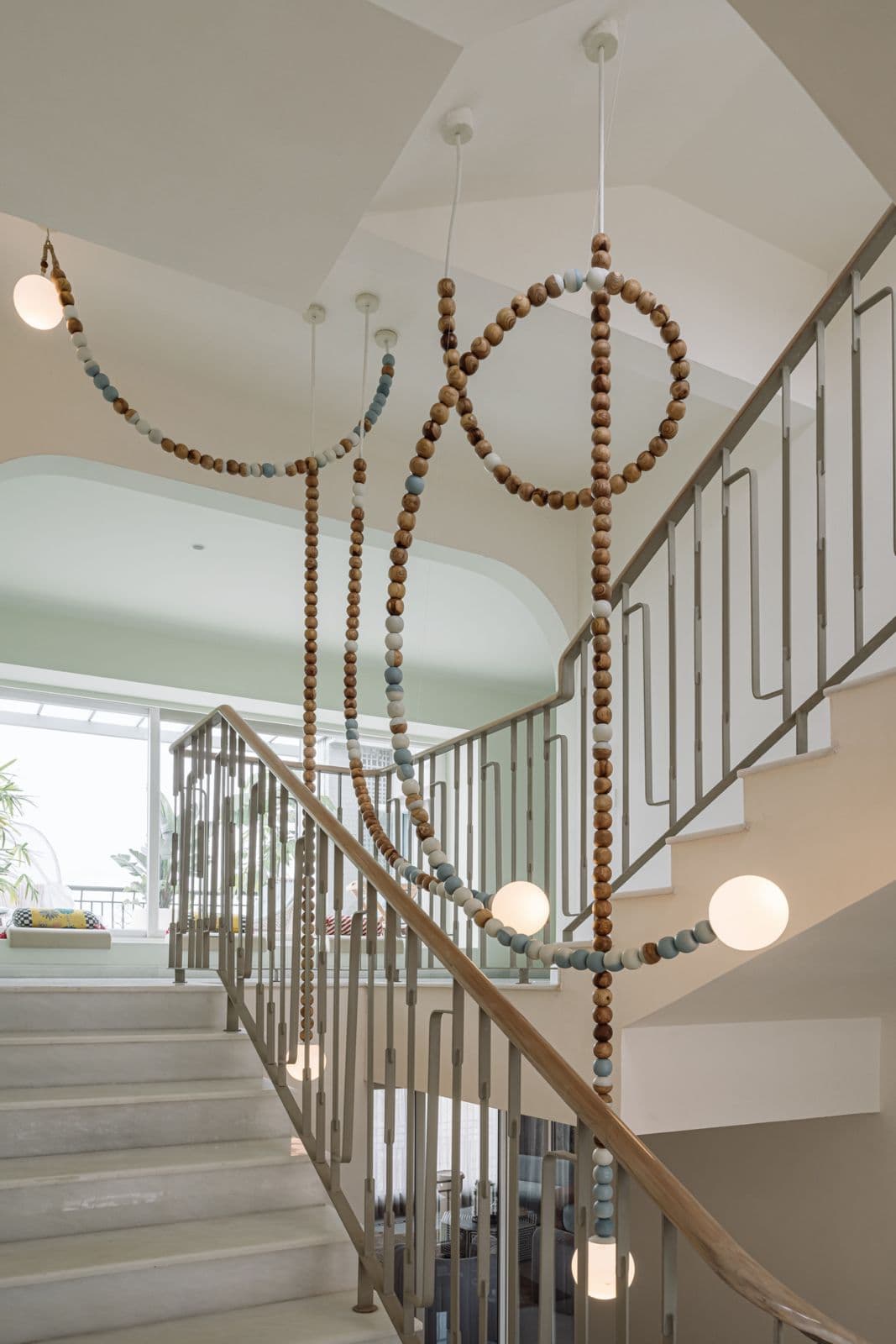 Meanwhile, the son’s bedroom—a joyful ode to childhood—is meticulously designed for adaptability. Powder blue and white beam-patterned ceilings, custom hanging lamps by MGM, and modular elements like a detachable ball pit and slide ensure the space grows with him, effortlessly transforming into a study or lounge in the years to come.