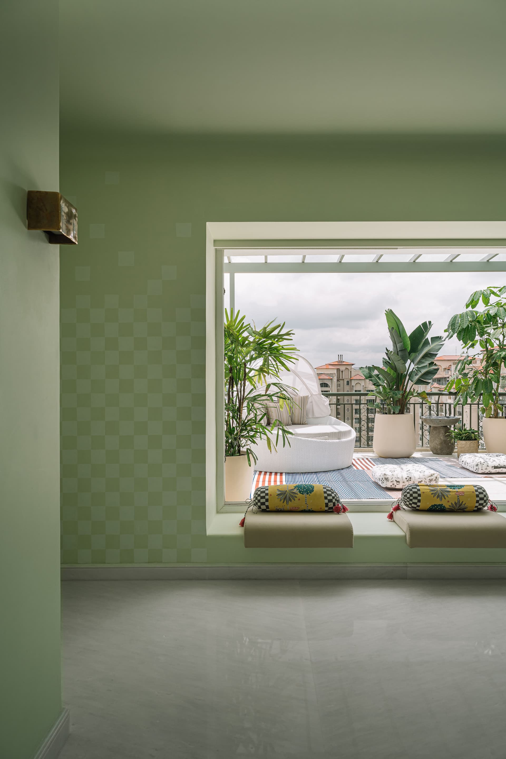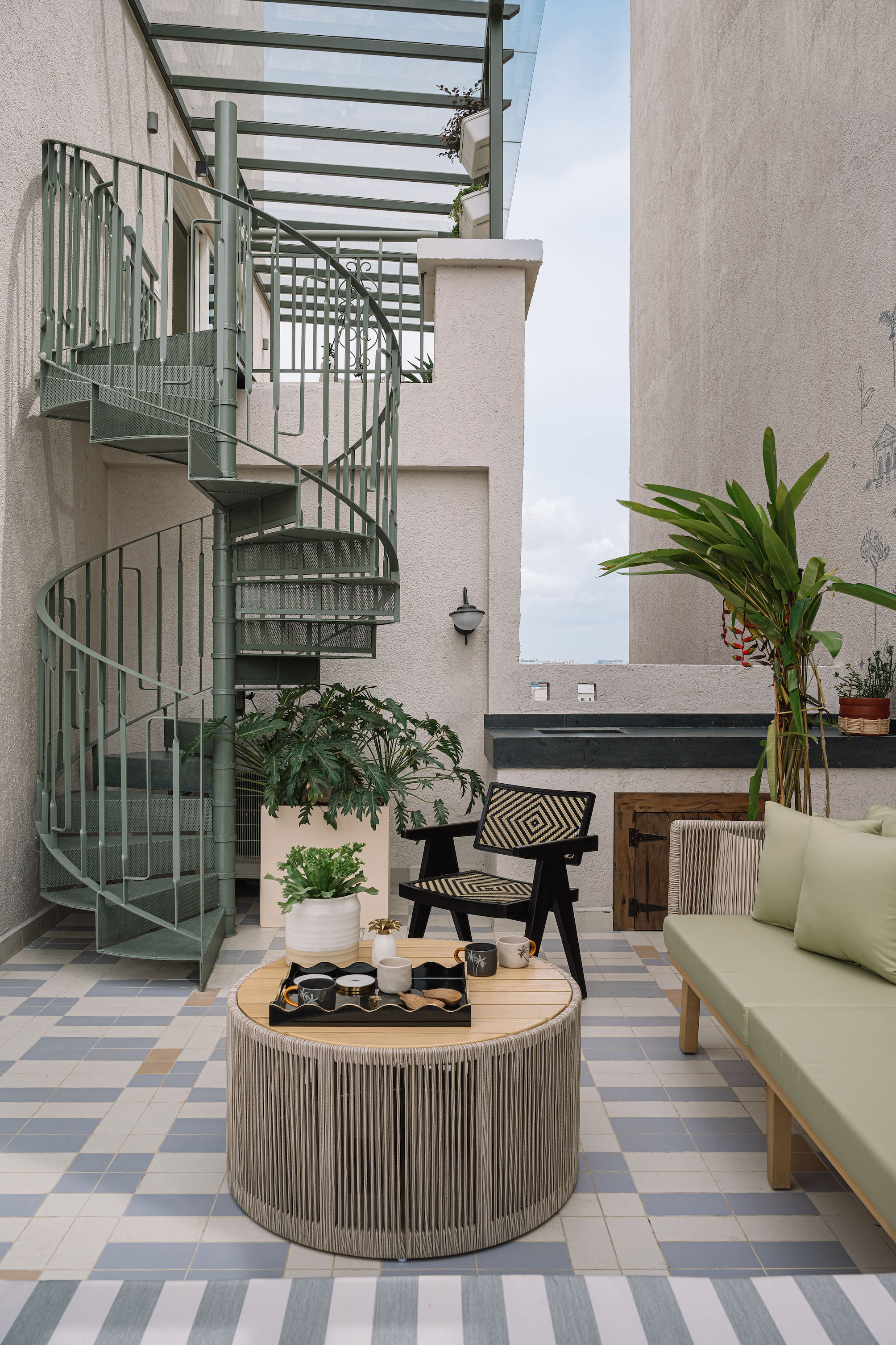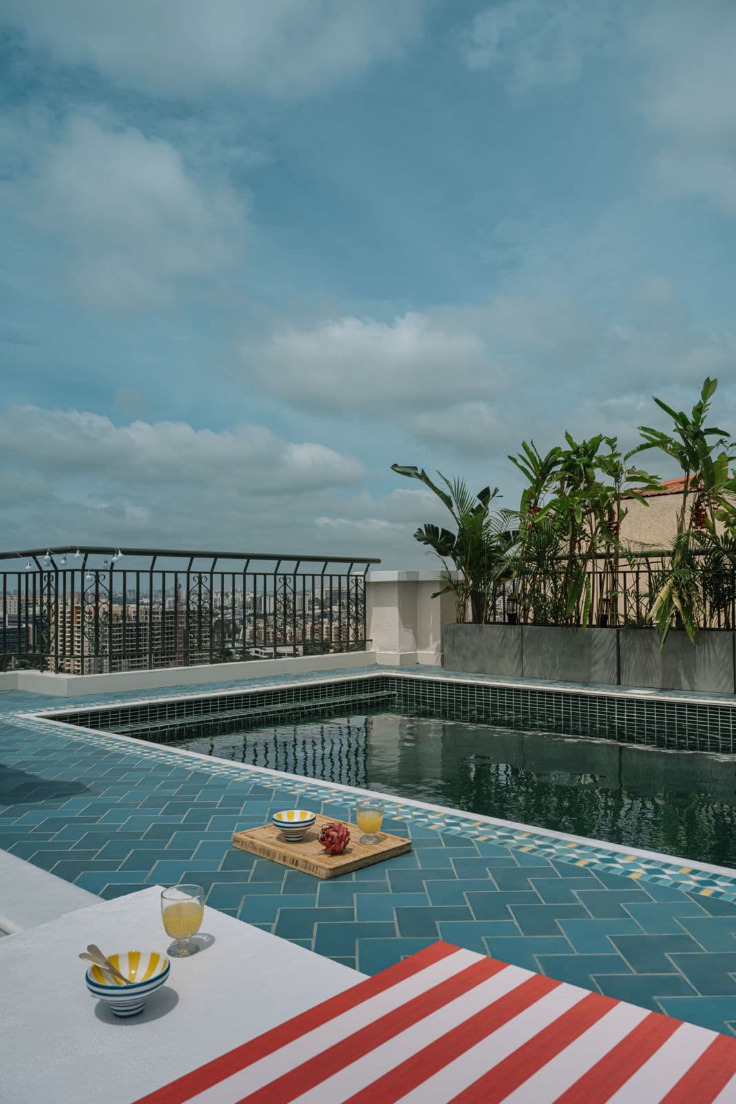 Crowning Eden House is its pièce de résistance—the rooftop terrace, where an azure-hued pool and amphitheatre-style seating conjure the glamour of a Côte d’Azur escape. White staircases contrast sharply with bright-red Breton-striped cushions, leading the gaze towards an infinity-edge pool that appears to dissolve into the Bengaluru skyline. A jewel-toned mosaic inlay wraps around the water, while frangipani-laden planters perfume the air. As twilight descends, carefully positioned lamps cast an ambient glow, allowing the terrace to shift from a lively daytime retreat to an intimate, moonlit haven.