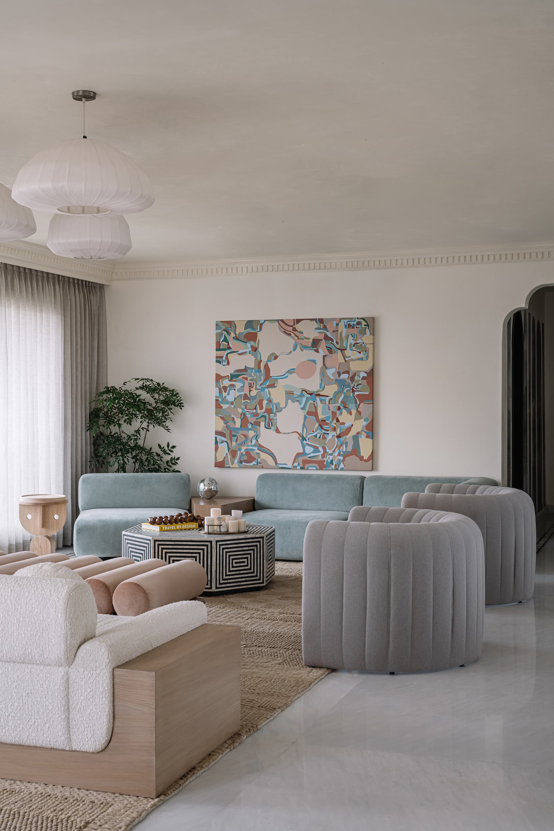 The main living area is a masterclass in texture, form, and artistic storytelling. A powder blue sofa, sinuous lilac armchairs from Sancal, and a dusty pink ottoman converge under a House of Beserk artwork—an abstract homage to the family’s travels. Quirky yet sophisticated, the space is anchored by distinctive elements like Sancal’s face-designed side tables and a custom gradient bar, designed by Purple Backyard in collaboration with Arjunvir Gujral under the label ‘no7.’ Marking the firm’s first foray into gold as a design element, the bar’s delicate arched frame adds a touch of quiet glamour without ostentation.