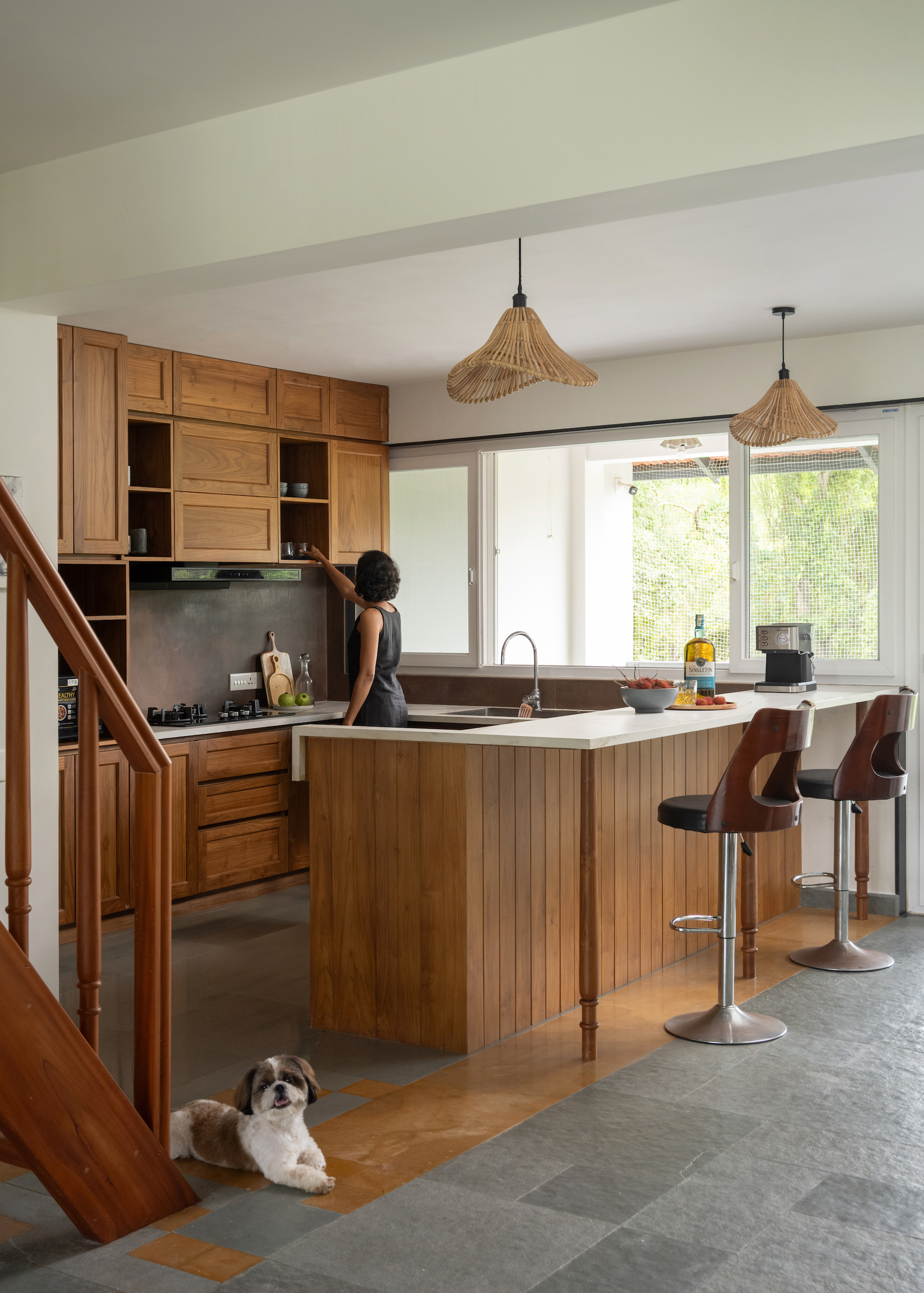 Adding a touch of nostalgia and craftsmanship, the ladder-style staircase showcases traditional teak wood joints and lathe-turned balusters, paying homage to Keralan artistry. The kitchen continues this narrative with teak wood shutters, a warm orange-streaked white countertop, and a copper-toned backsplash, blending elegance with functionality.