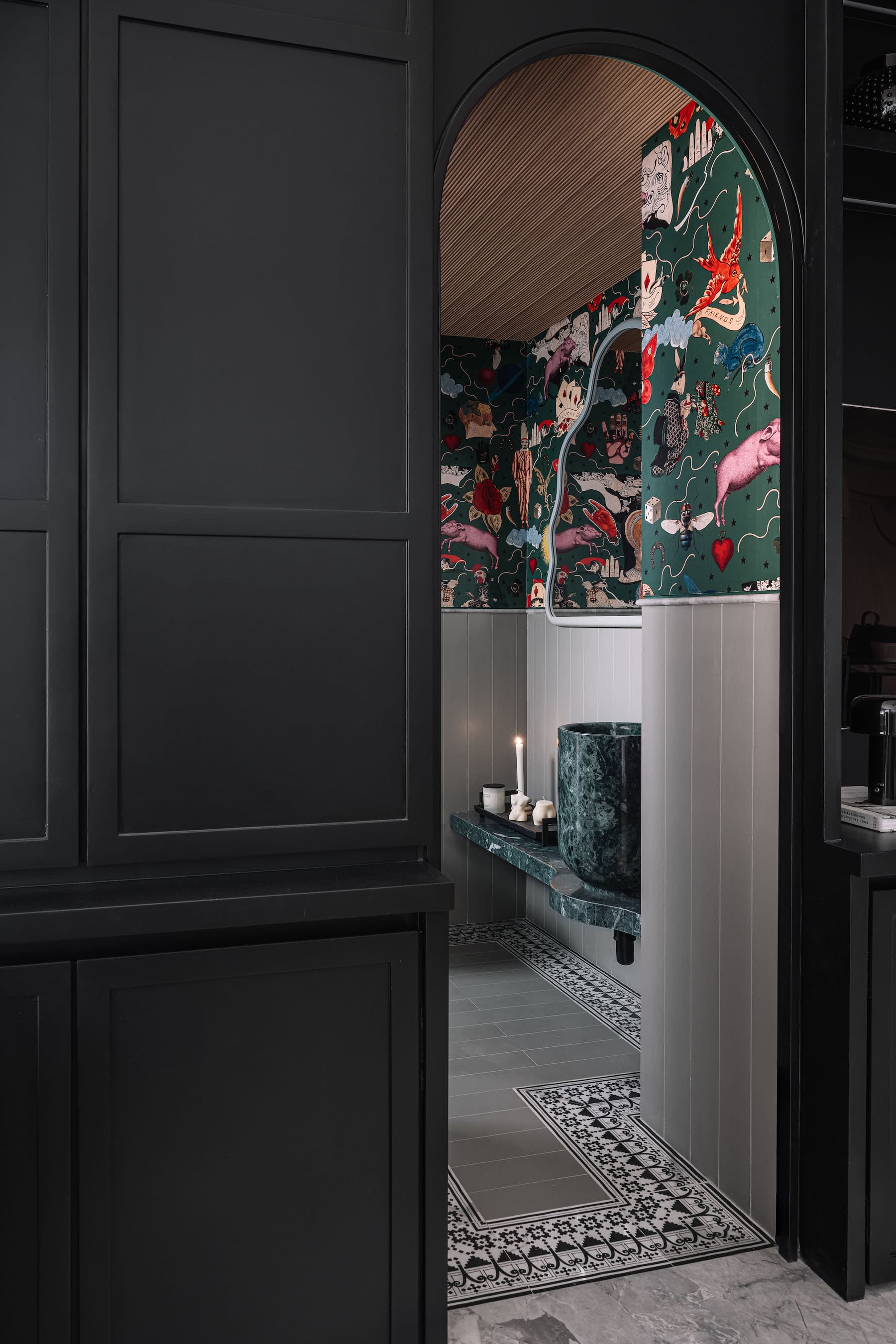 Beyond the living space, the den transitions into a monochrome sanctuary of black and white tones. This space is an embodiment of quiet glamour, with clean lines and sophisticated finishes. The adjoining powder room, however, surprises with its dramatic burst of energy—a green, esoteric wallpaper that feels like an organic rebellion against the room’s otherwise subdued palette.