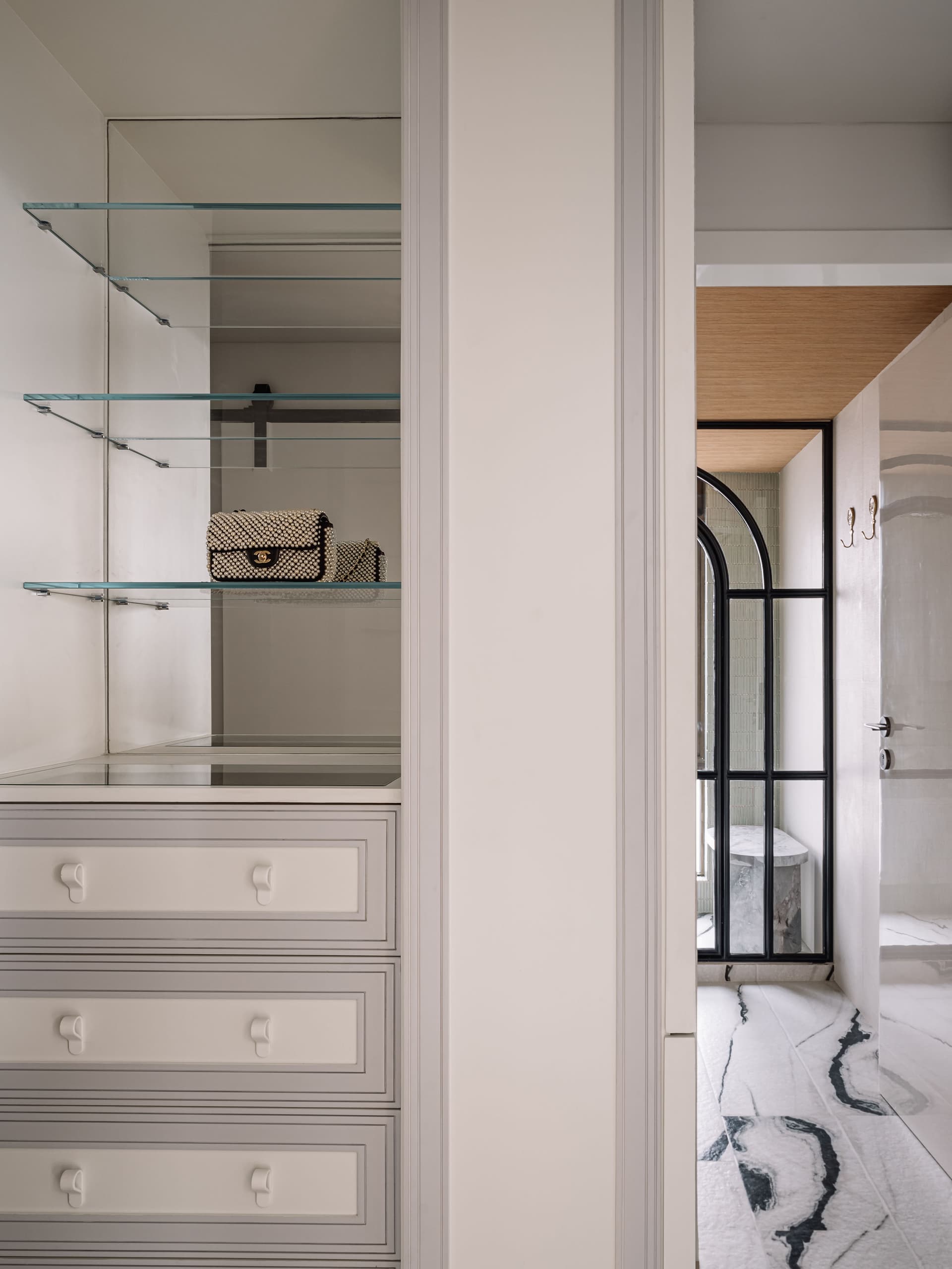 The adjoining walk-in closet, cloaked in soft lilac tones, leads to a spa-like bathroom. Here, Panda marble takes center stage, complemented by Kitkat tiles and a handcrafted marble sit-out that speaks to the artisanal craftsmanship woven into the design. Every element in this space is chosen to evoke a sense of tranquility and understated opulence.