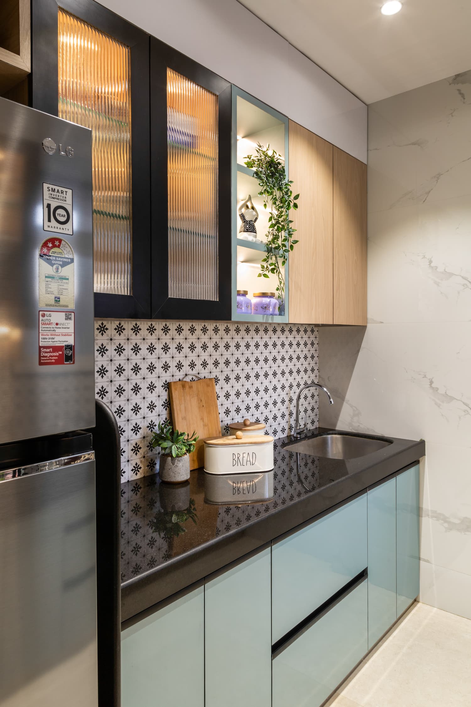 The kitchen is an exquisite blend of form and function. The glossy mint blue finish lends a serene freshness, which beautifully contrasts with the black granite countertop. The white and black backsplash tiles with their echoing motifs create a captivating visual imprint, while the wooden and fluted glass cabinets add a delightful textural layer.
