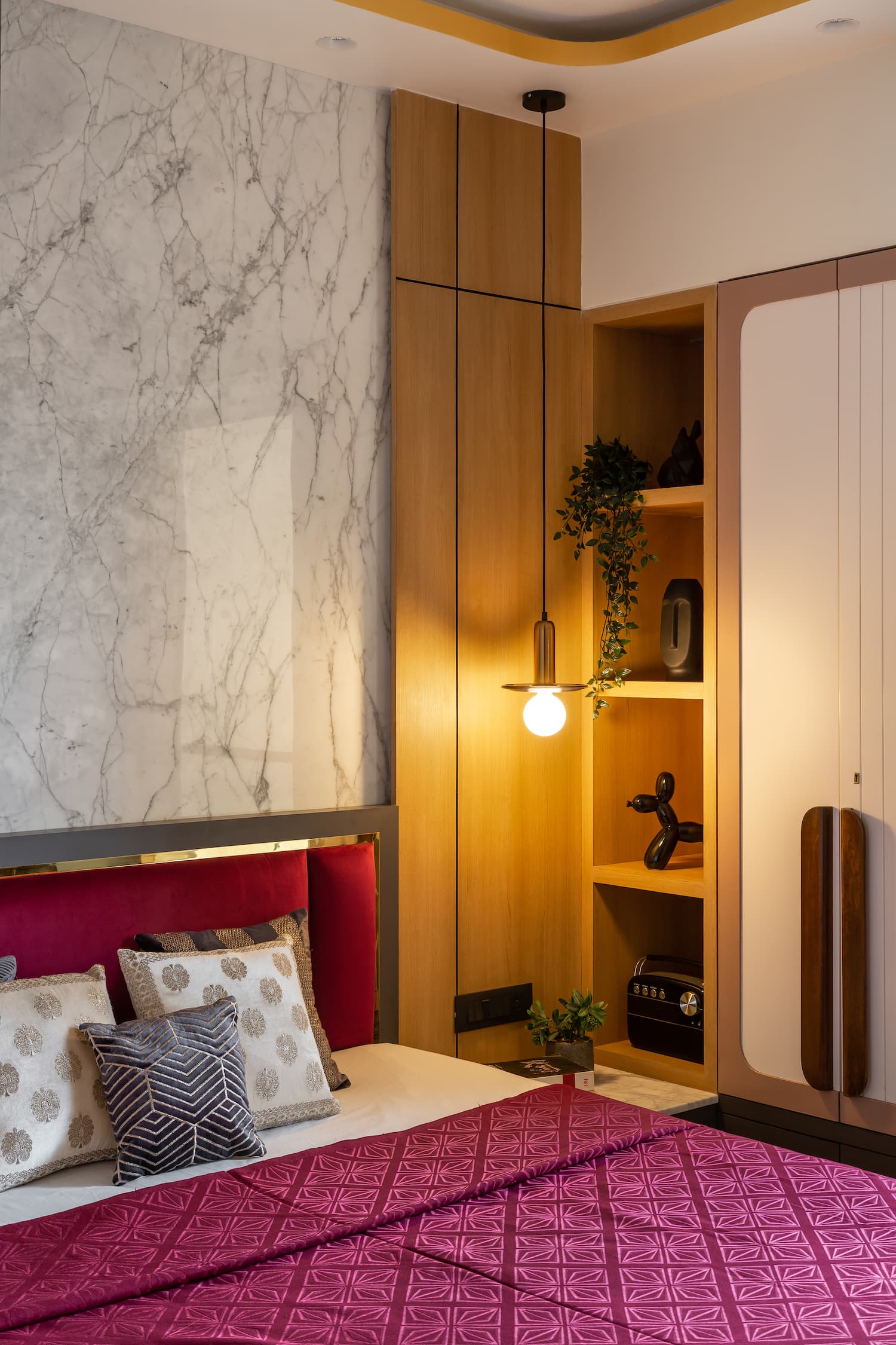This lavish master bedroom exudes boldness and energy, immersing visitors in a plush and luxurious theme. The oak wood wall panels and white statuario wall cladding impart an air of sophistication and elegance to the space. The PU-finished wardrobes are fitted with customized extended teakwood handles and adorned with elegant golden accents, adding a touch of opulence to the room.