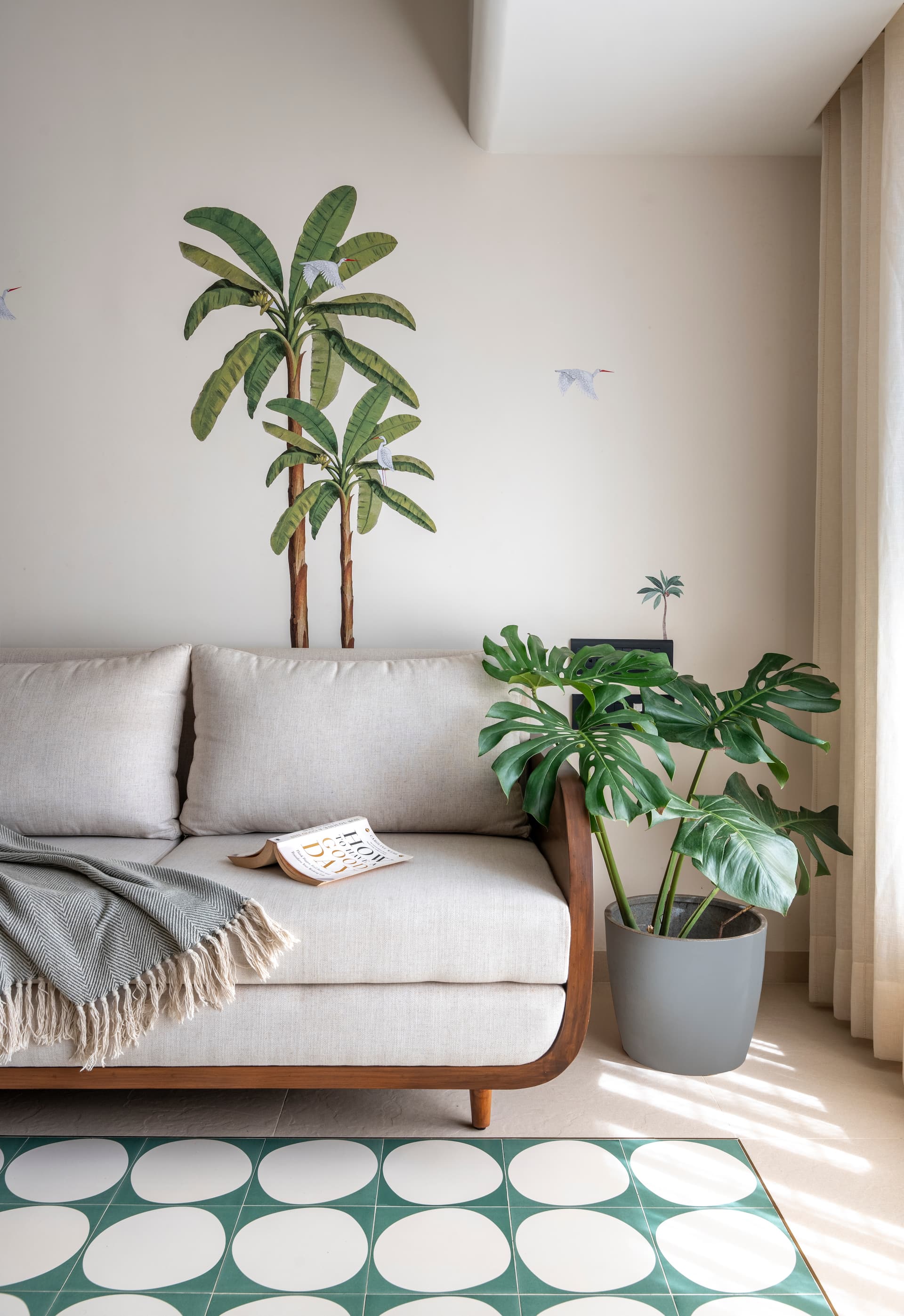 The design narrative unfolds from the entrance, where teak wood and teak veneer wrap the main door, shoe cabinet, and credenza, establishing a sense of continuity and permanence. This warmth flows seamlessly into the living area, where muted backdrops are gently animated by indoor greenery and hand-crafted bird and botanical wall decals by KalakaariHaath. A defining feature of the space is the custom egg-shaped tiled carpet composed of bottle green and off-white tiles, edged with a delicate brass inlay. Designed to emulate the softness of a rug through architectural means, it anchors the seating arrangement while adding texture and visual depth. Solid teak coffee and side tables detailed with birch plywood legs and brass accents complement the generous sofa and accent chairs, while the entertainment wall in teak veneer integrates floating shelves and a tall open library. A matte black MS pipe framework extending to the ceiling introduces a subtle industrial edge, remaining functional without disrupting the overall warmth.