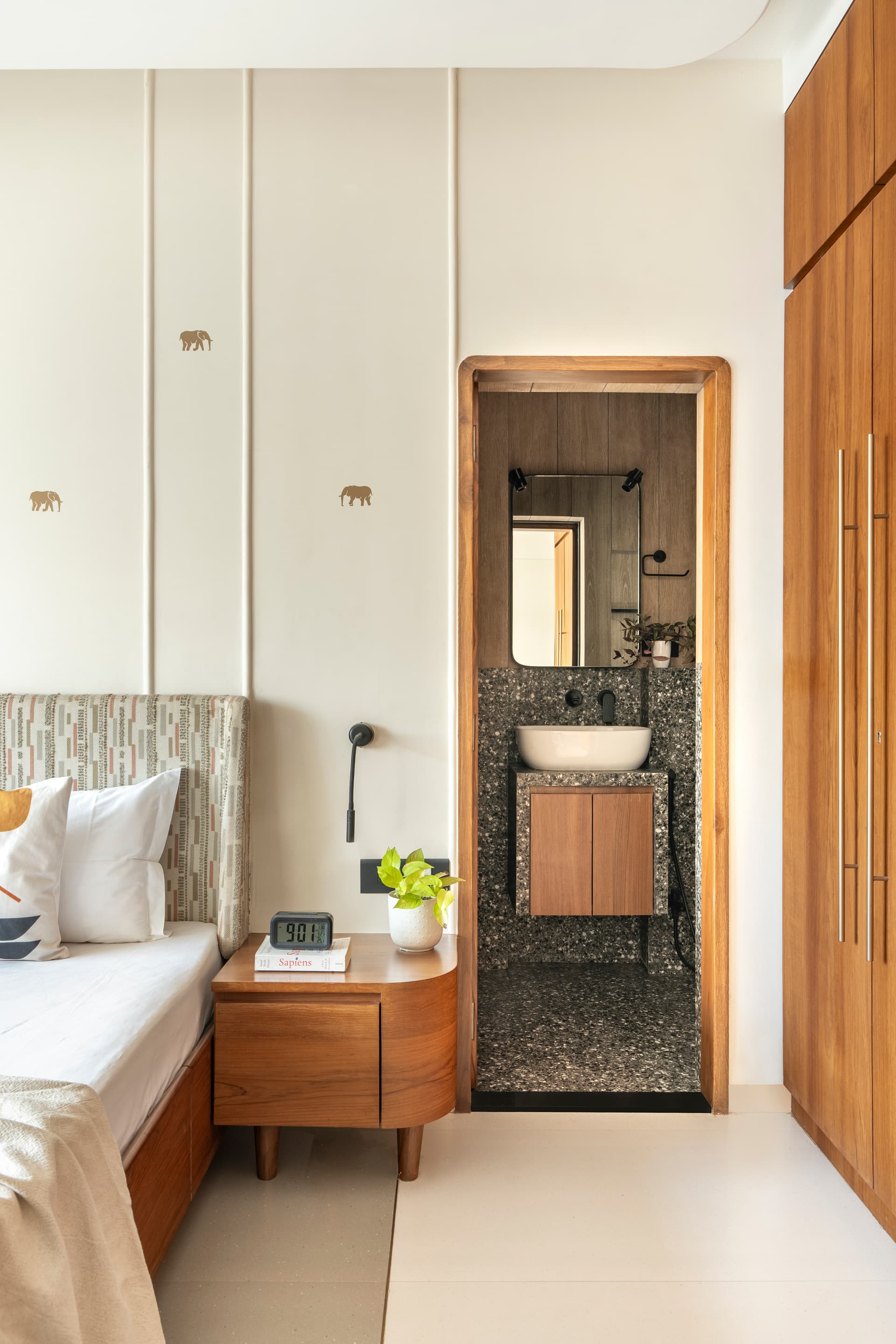 Adjacent to the living area, the dining space continues the home’s material dialogue with a bespoke terrazzo tabletop supported by four teakwood cylindrical legs, each varied in proportion to create a sculptural presence. A multifunctional crockery unit crafted from teak wood, birch ply, and fluted glass balances openness and storage, while a terrazzo ledge echoes the dining table’s finish, visually tying the elements together. In the kitchen, Jetsons adopts a restrained monochromatic palette, combining leaf green laminate lower cabinets with light wood-toned uppers. A green-chip terrazzo countertop paired with a sage kit-kat tile backsplash adds texture while maintaining a light, cohesive aesthetic within the compact layout.