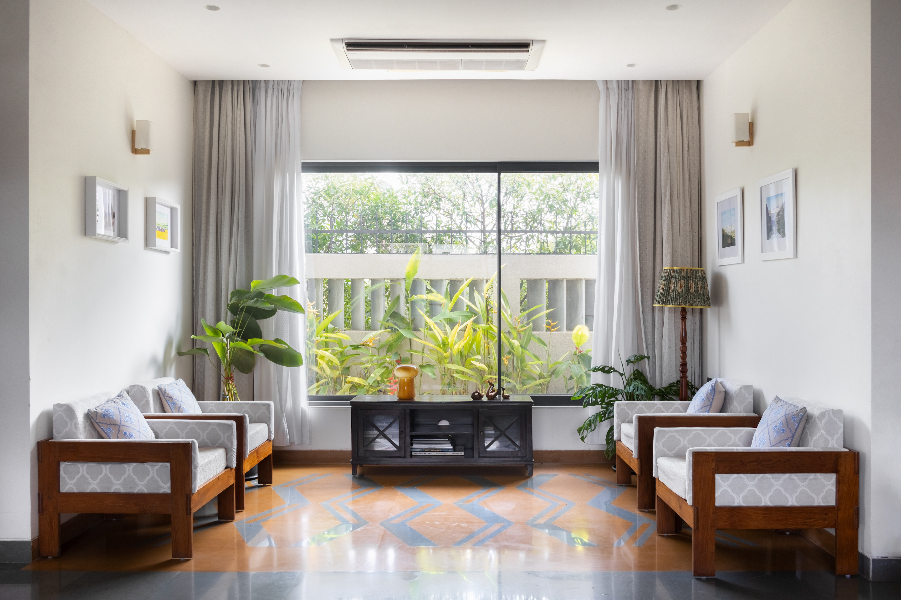 Materiality is handled with similar discipline. The exterior palette – exposed brick, white plaster, and raw concrete, is deliberately limited, allowing form and shadow to animate the façade. Patterned brickwork appears selectively, lending depth and texture while responding to changing light across the day. Inside, the language softens but remains cohesive. Polished Kota stone flooring runs throughout the home, creating a seamless visual base. Carefully placed inserts of yellow Jaisalmer stone, rough Kota, and white marble introduce gentle variation. One of the most evocative moments is a sunlit corner of the living room, finished entirely in yellow Jaisalmer stone, a quiet reading nook that captures warmth both literal and emotional.