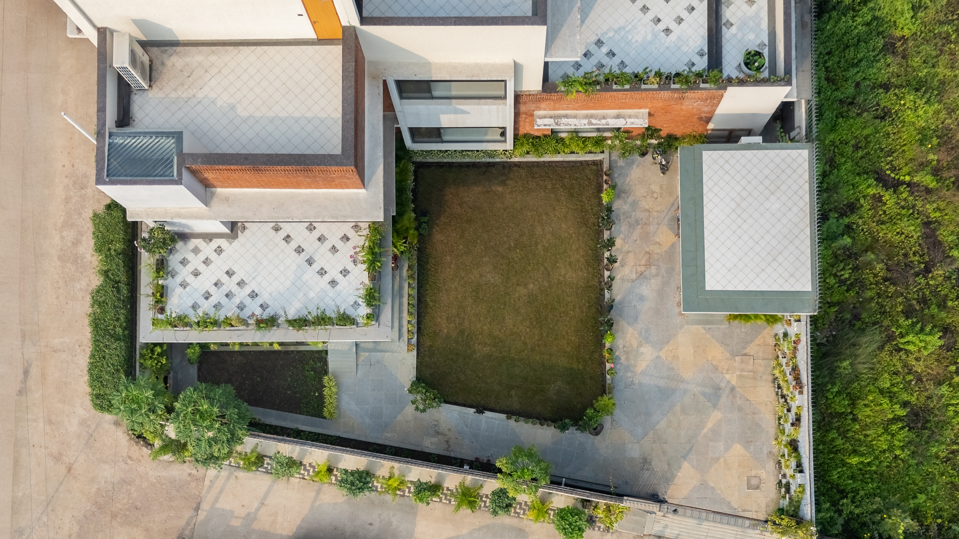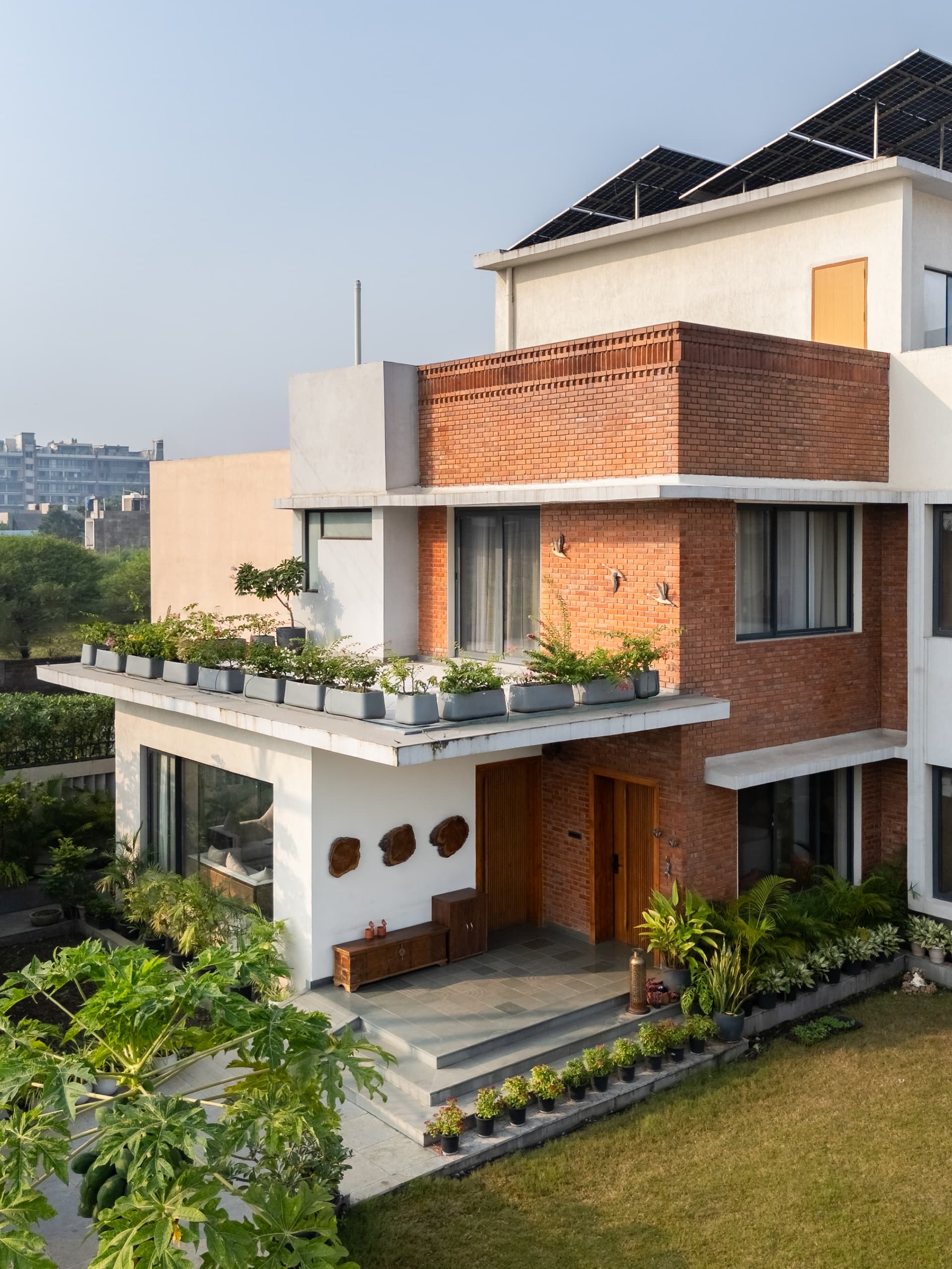 The architectural narrative begins with the L-shaped plan, a decisive move that opens the house toward the north and east, inviting in generous daylight while shielding interiors from Raipur’s harsher sun. This orientation is not merely climatic but experiential. As one moves through the home, spaces unfold with intuitive ease – living areas flowing into gardens, terraces stepping back to create moments of pause and prospect. Each level enjoys visual continuity with the landscape, ensuring that greenery remains a constant companion. The house feels porous yet protected, open without ever feeling exposed.