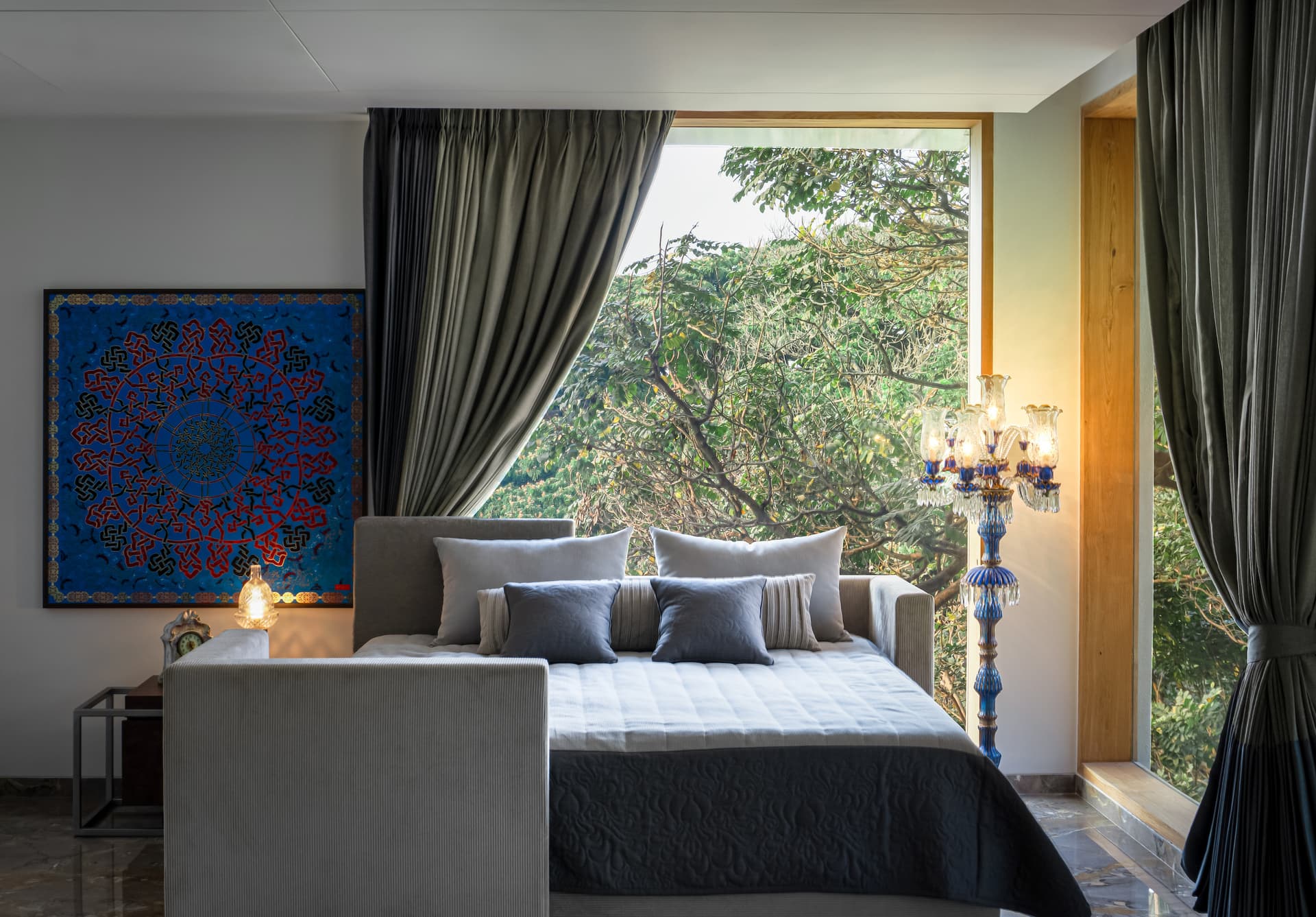 Hira’s private quarters unfold with a sense of deliberate introspection, balancing grandeur with restraint. The master bedroom, nestled in the treetops, is a cocoon of quiet luxury, where a framed blue silk scarf—an heirloom—rests beside the bed, and twin oval tubs in muted grey invite one to soak in the uninterrupted canopy views.