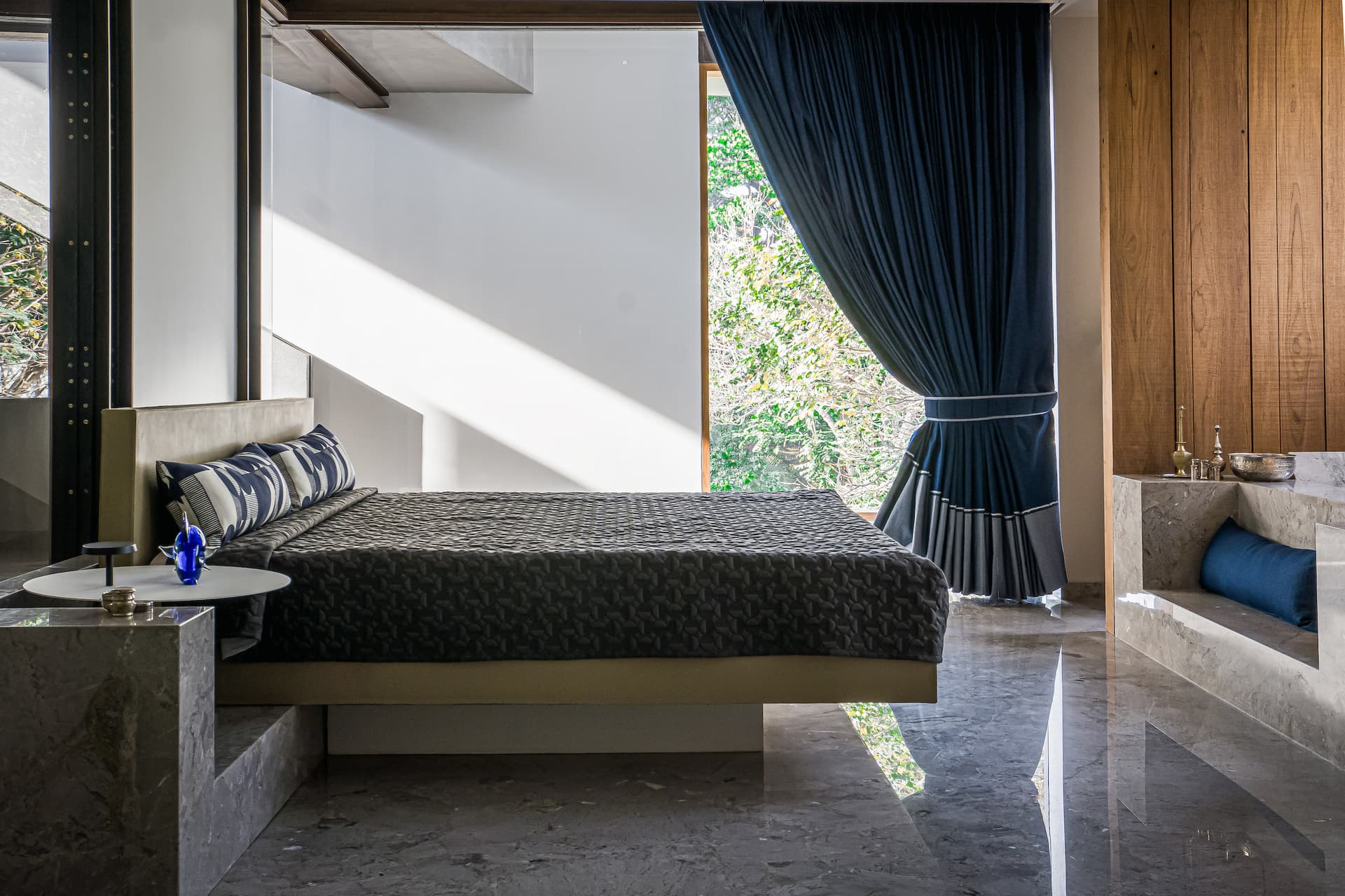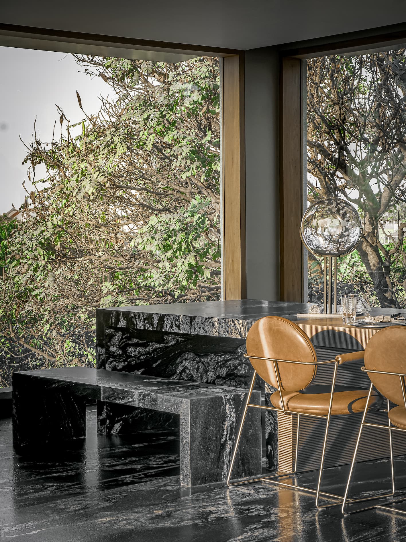 The residence is a study in contrasts, where materials and textures converse in quiet, poetic discord. The living room, an expanse of sculpted tactility, juxtaposes a checkerboard of tiger’s eye inlay on black marble against rugged concrete walls, its rawness tempered by heirloom fabrics draped over contemporary seating. A striking dining lounge floats between earth and ether, centered around a dual-material dining table—wood on one side, dramatic flamed granite on the other. Above, a Murano glass sculpture refracts light into an ever-shifting kaleidoscope, while floor-to-ceiling openings frame the lush outdoors.
