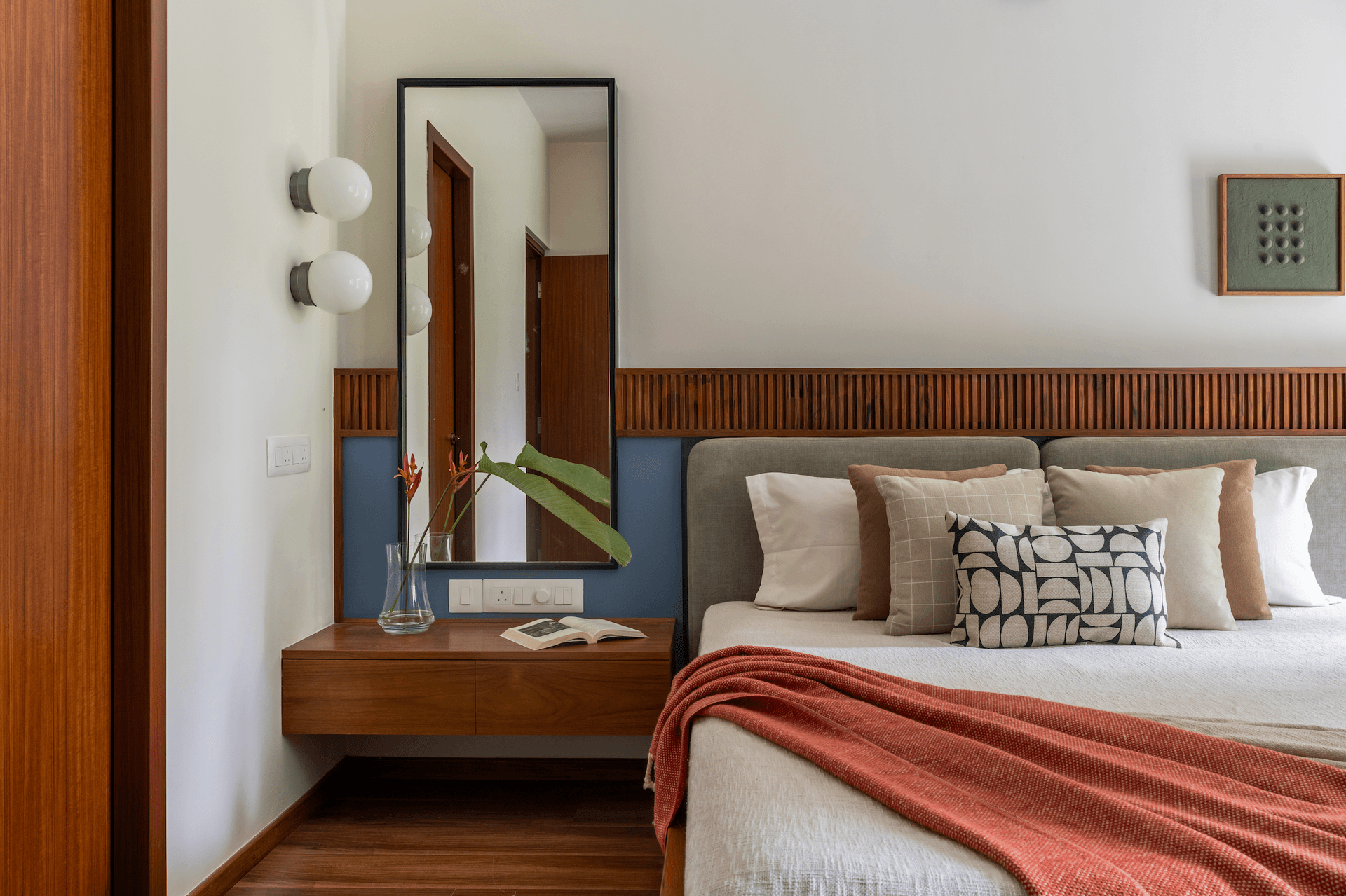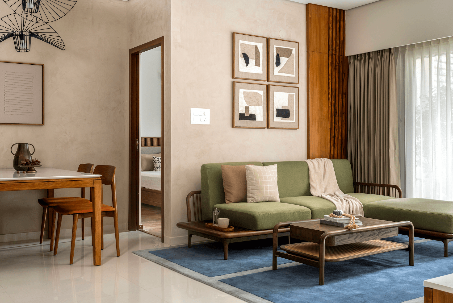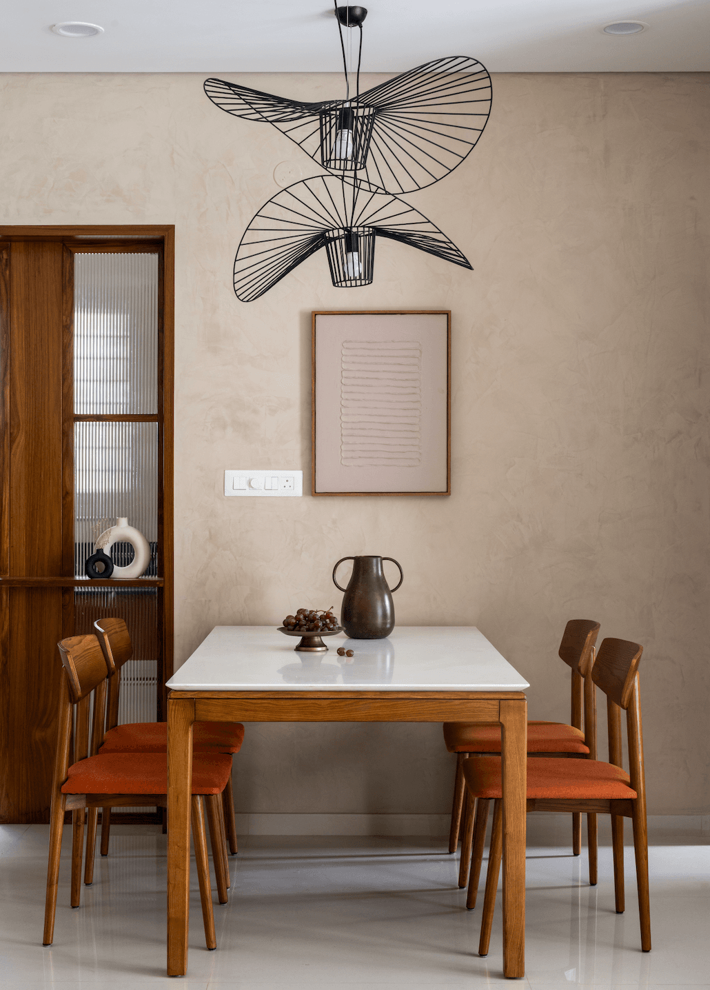 There are homes that rely on spectacle, and then there are homes like Summer Soirée – spaces that quietly unfold, revealing their character through light, material, and mood. Designed as a compact 3BHK in Bangalore, this 1,800 sq ft residence is anchored not by excess, but by atmosphere. Sunlight becomes the primary design element, grazing softly across textured stucco walls and settling gently on natural teak surfaces. The effect is immediate yet restrained: the interior feels bright without sharpness, warm without heaviness.