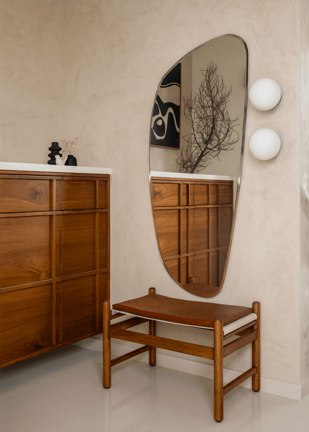 The living spaces articulate a careful balance between visual serenity and tactile richness. Sleek, low-slung furniture pieces in warm wood tones establish a grounded base, while olive and muted green upholstery introduces a sense of quiet vitality. Rather than dominating the palette, color behaves as a subtle undercurrent – present, deliberate, and soothing. A sculptural black pendant above the dining table injects contrast and rhythm, its graphic lightness offsetting the otherwise earthy composition. Artworks and objects, abstract and material-driven, reinforce the home’s language of softness and restraint.
