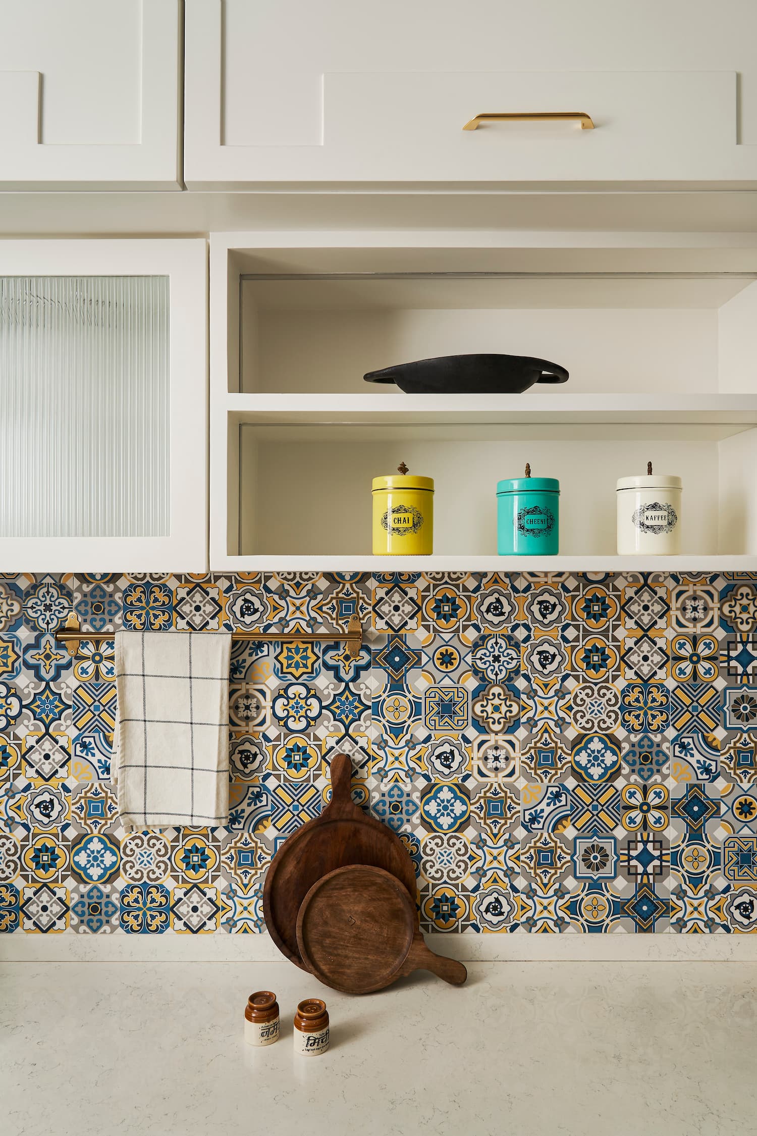 Embodying a Moroccan-Scandinavian theme, the kitchen showcases a colour scheme of royal blue and ivory. The overhead storage is finished in ivory, Moroccan tiles with a blue base form a backsplash for the white and grey kitchen counter and the undercounter furniture is designed in royal blue. The sliding door for the kitchen features fluted glass frames in royal blue polyurethane.