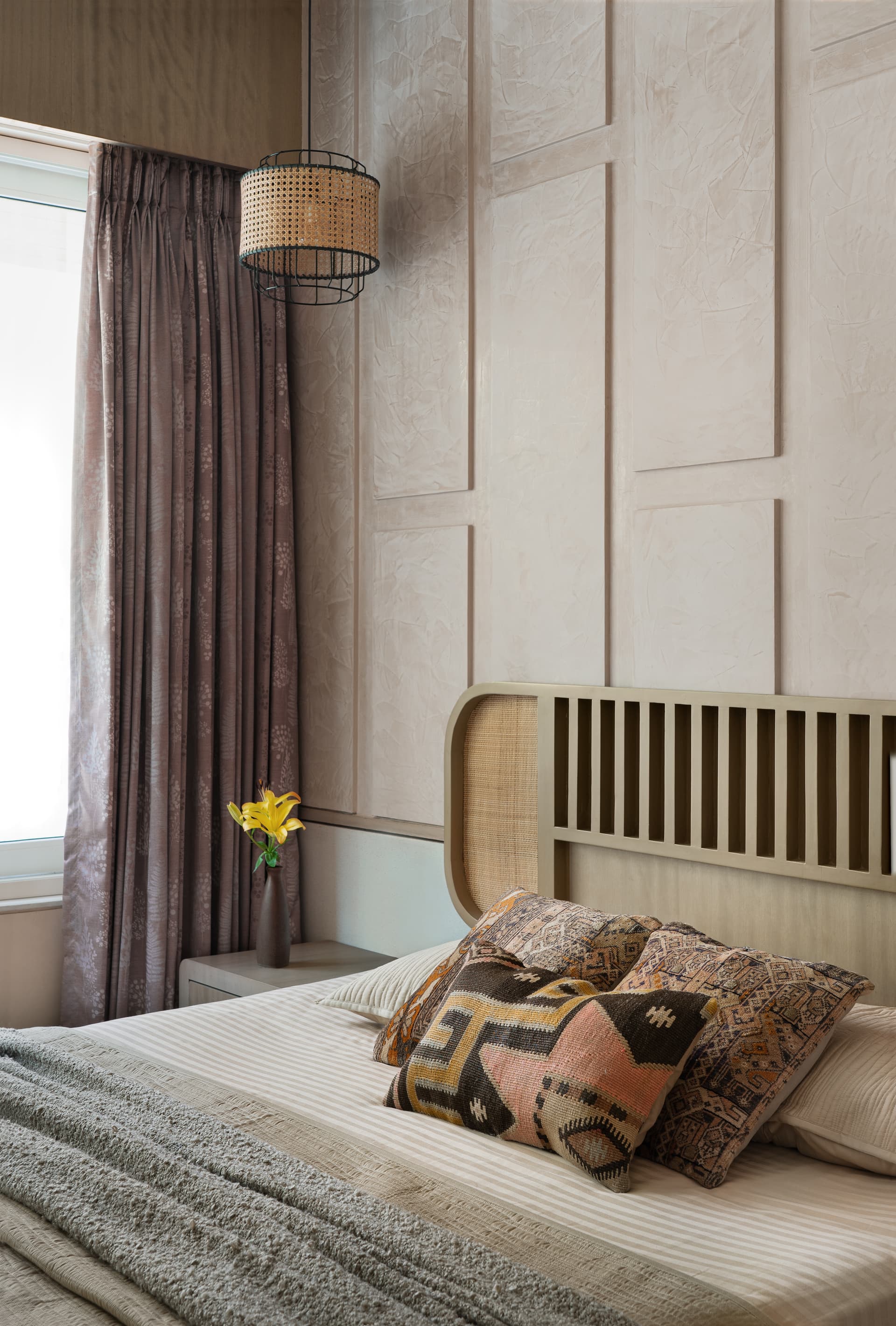 To create a calm and composed atmosphere for the elderly couple, the room is designed with a zen approach. Rectangular offset geometric design, finished with stucco texture paint in beige on the backdrop of the bed achieves a monochrome appearance. The wardrobe is crafted using ash grey veneer and cane material for a natural look.