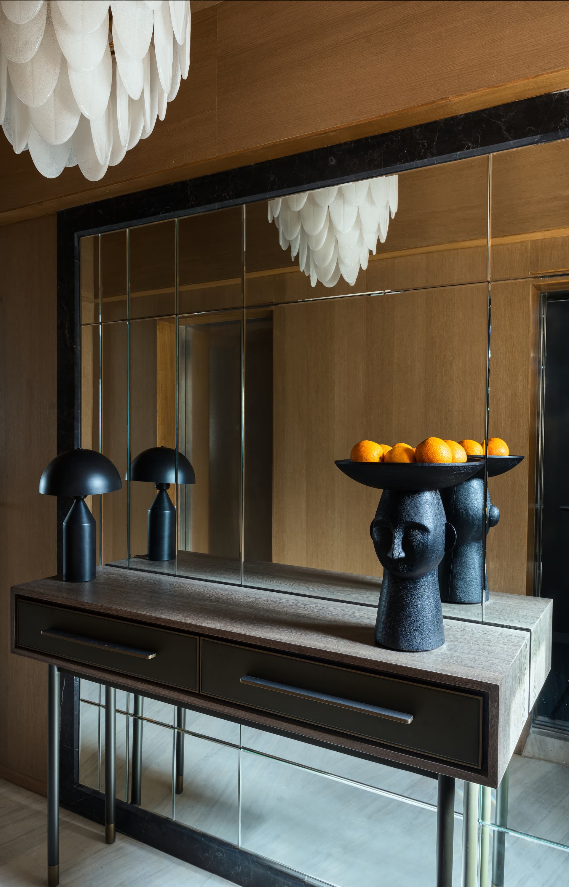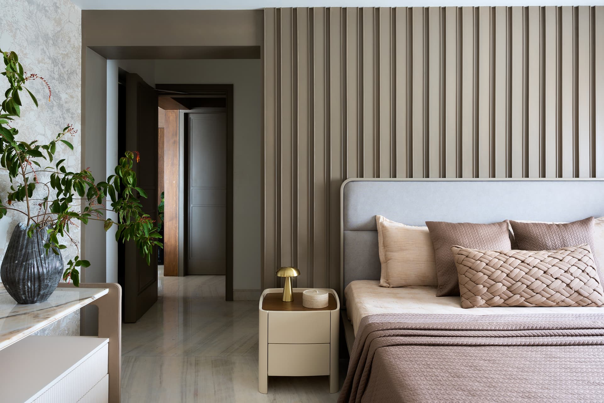 The true focal point of this exceptional residence resides within the living and dining area itself. Here, a captivating white marble wall takes center stage, creating a striking visual contrast against a ribbed fluted oakwood wall. This juxtaposition not only adds a sense of depth to the space but also conceals discreet entrances, adding an element of intrigue to the design.