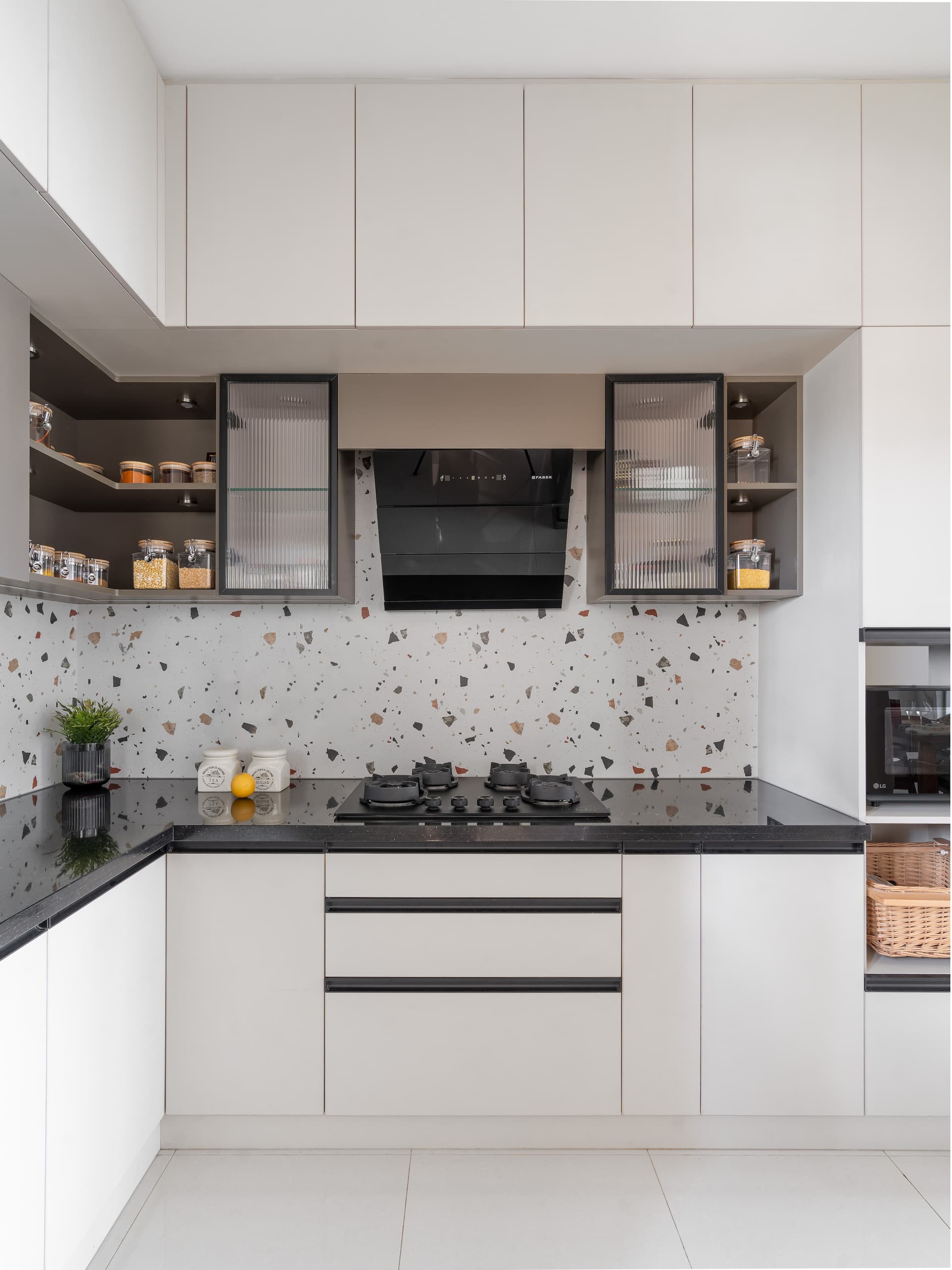 A terrazzo-inspired backsplash adds a playful and artistic touch to the kitchen, infusing the space with subtle patterns and flecks of colour that break up the monochrome scheme with a hint of whimsy. This choice of material not only introduces texture and visual interest but also ties together the design elements, creating a cohesive and dynamic backdrop that enhances the overall aesthetic.