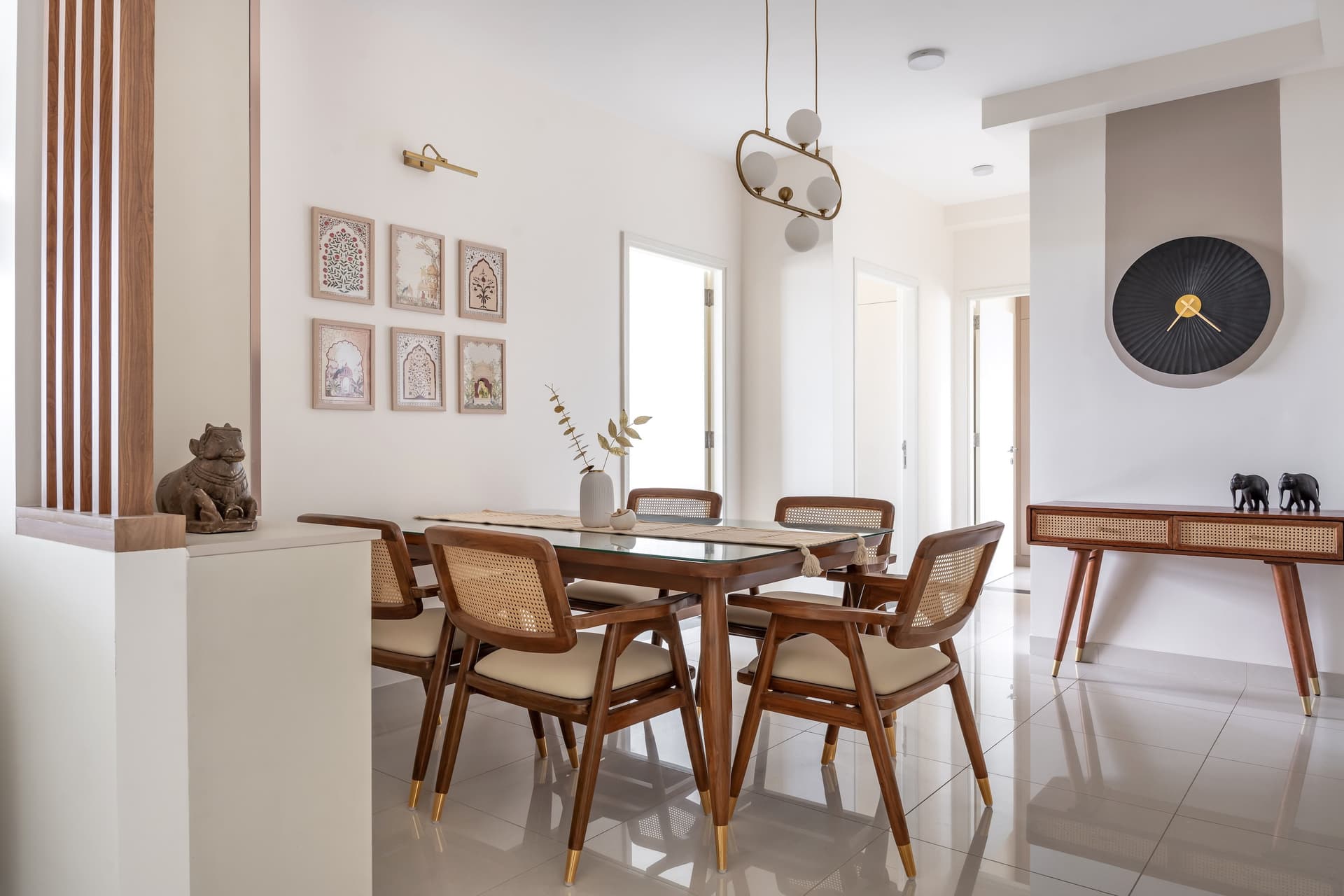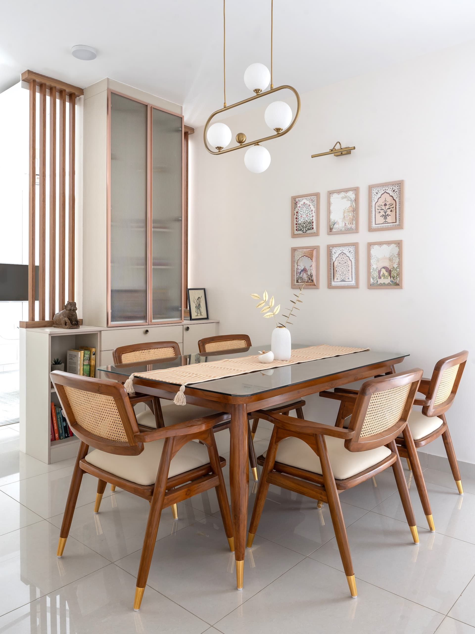 In the dining area, the design narrative continues its graceful flow, embracing the warmth and natural textures of wood and cane. The space is anchored by beautifully crafted chairs, their cane backs and wooden frames adding a touch of artisanal craftsmanship that complements the overall aesthetic. These chairs are not merely functional but serve as key design elements that enhance the room’s visual appeal, inviting guests to linger longer.