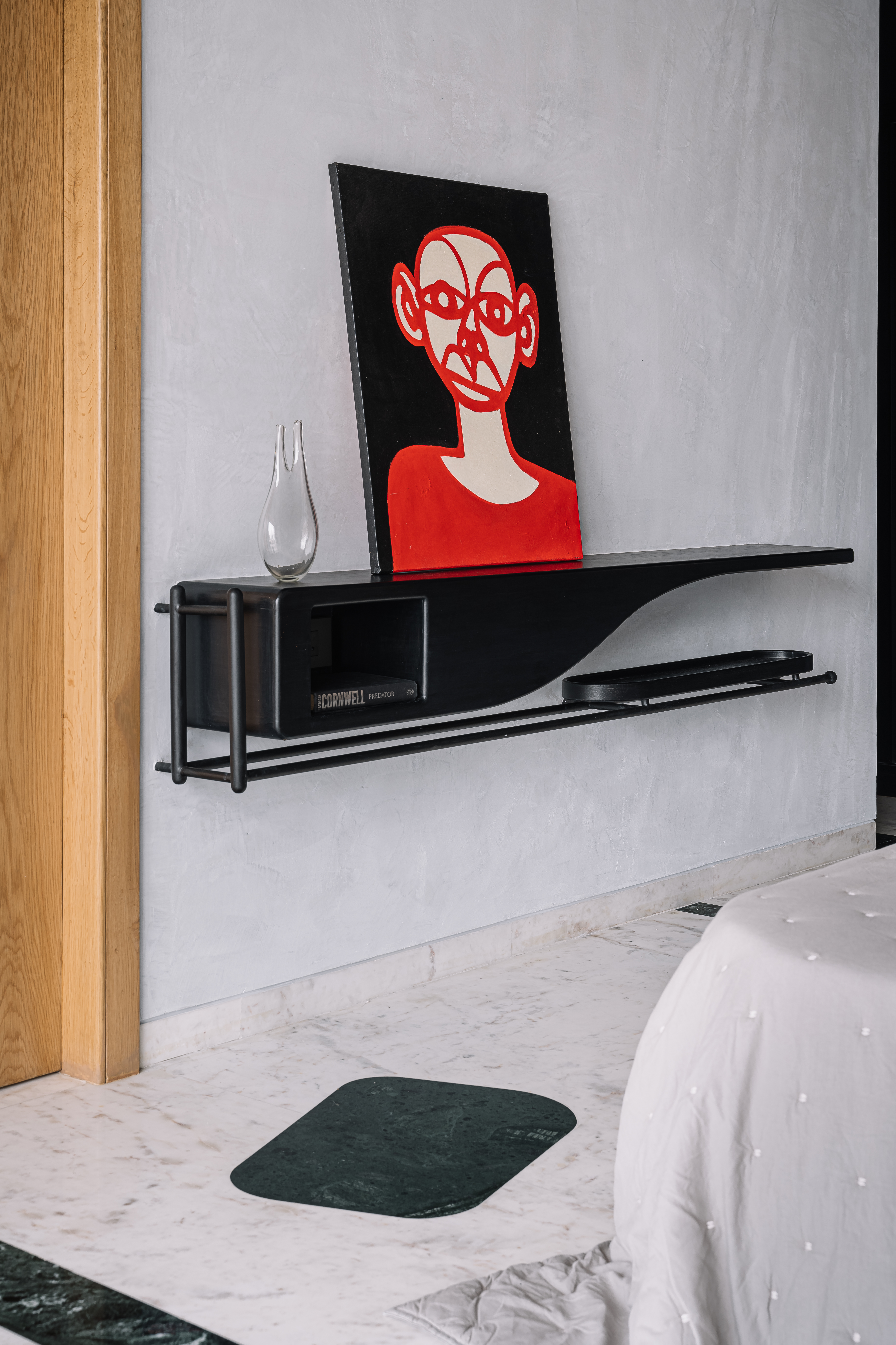 The third bedroom is definitely the finale of this trajectory of classic modernism. Bold and dynamic, to match the persona of the youngest member of the family it is scripted with convention-defying side tables, a sculptural light accent in the backdrop of grey textured walls and inlays of kesariyaji green marble on the floor.